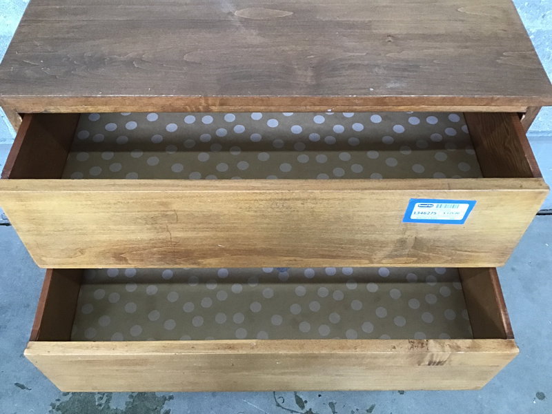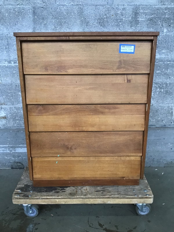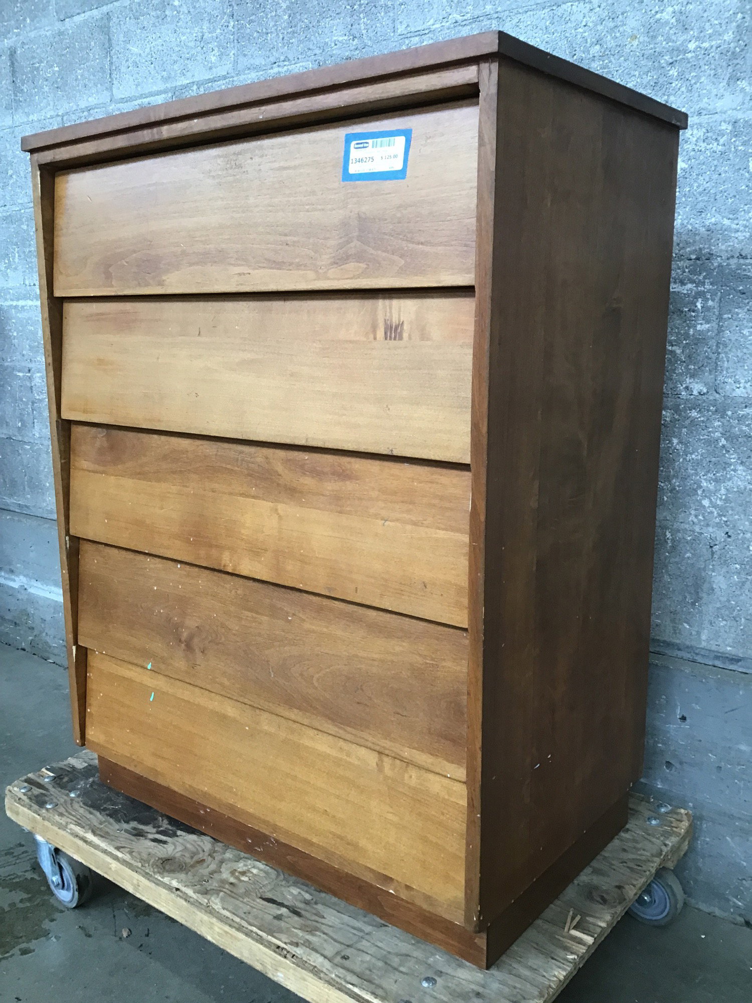 This vintage 5-drawer dresser offers angled drawer faces, a buttery stained finish and the kind of look that could fit in old and new spaces alike. It's not terribly big, so this could be a good candidate for someone with a small room or studio apartment. It has a few scuffs and some paint speckles on the lower drawers but is in great shape overall.