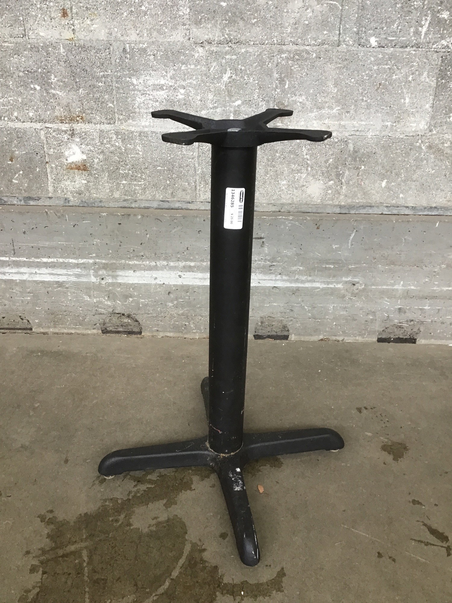 Hearty steel cafe table base in search of a fabulous top. Check out or selection of live edge slabs and butcher block for a possible pair!