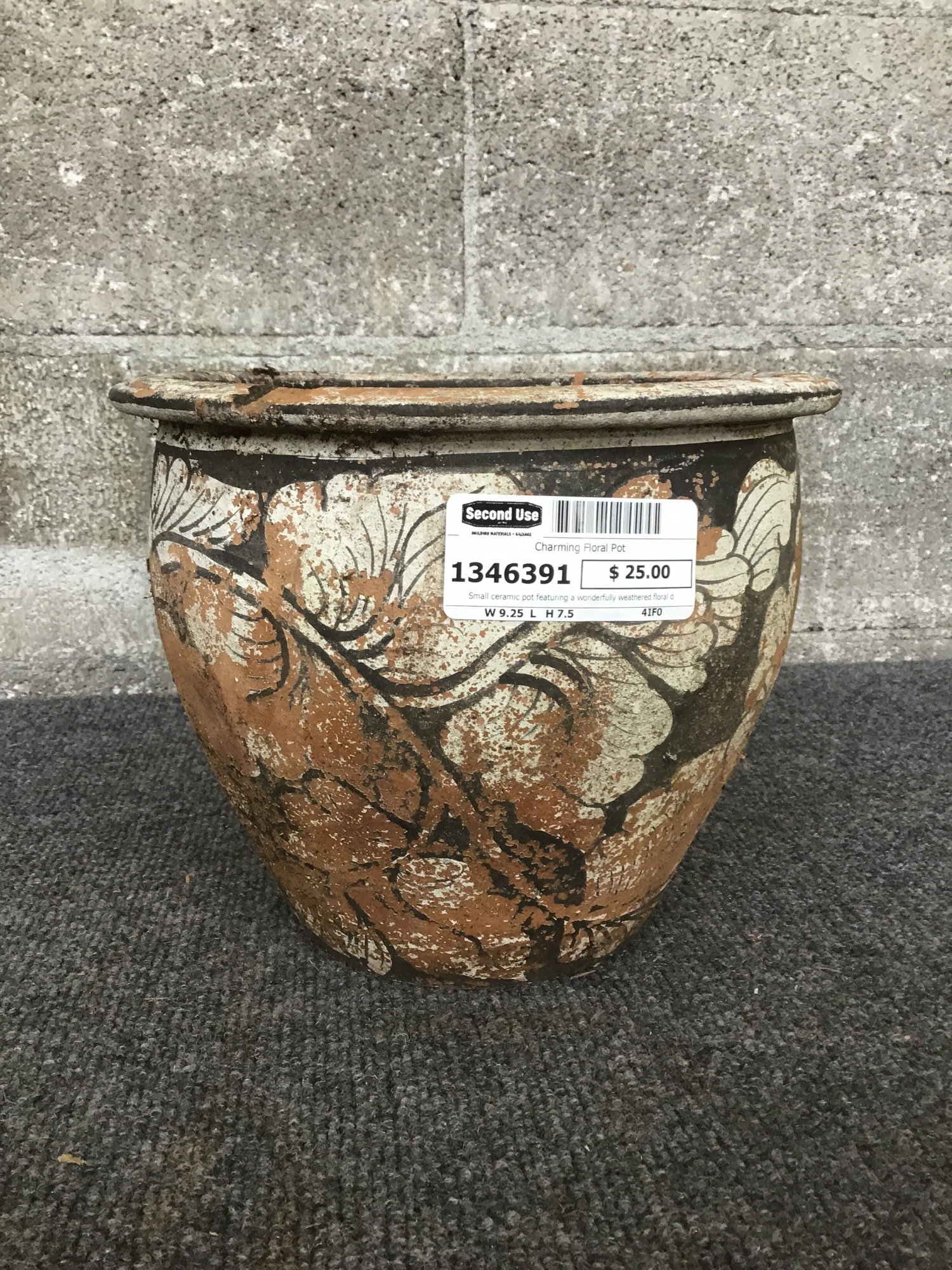 Small ceramic pot featuring a wonderfully weathered floral design and just the right amount of chippiness around the lip.