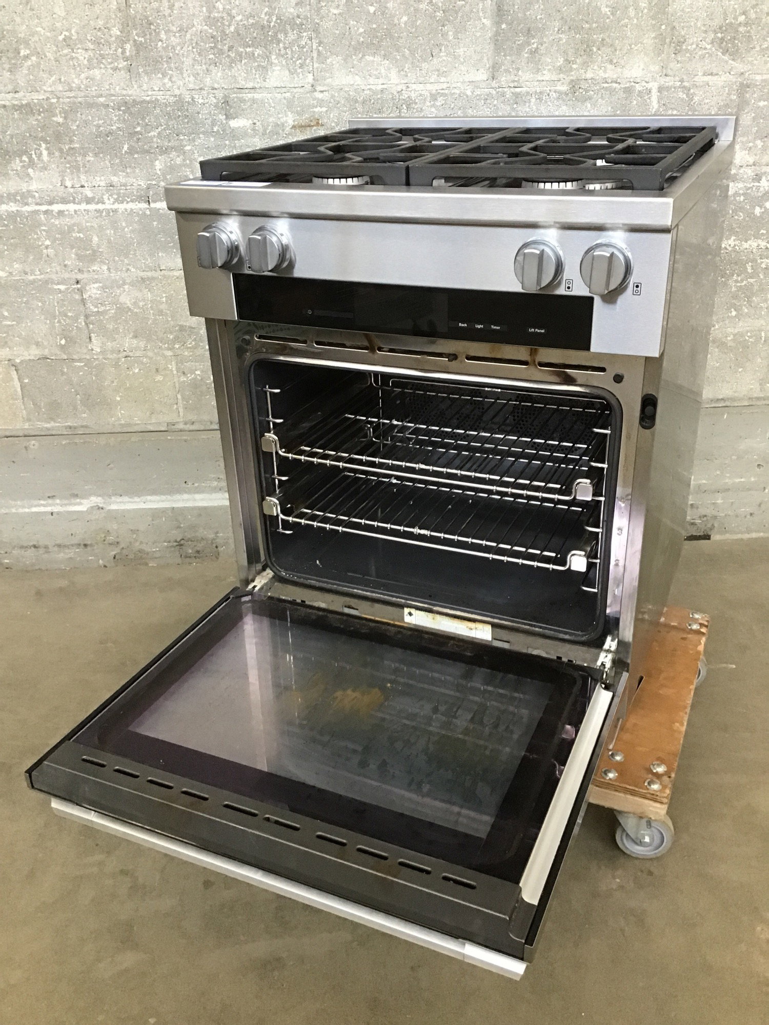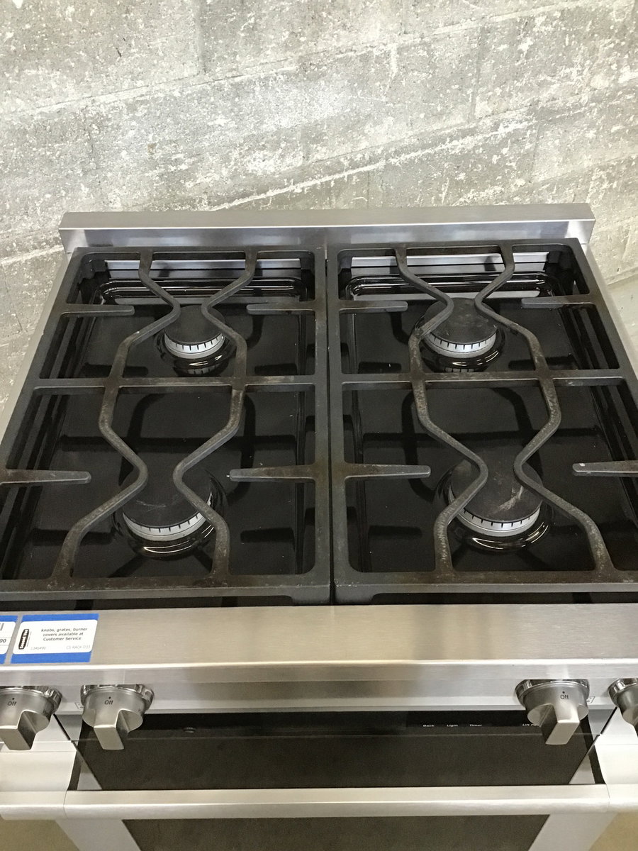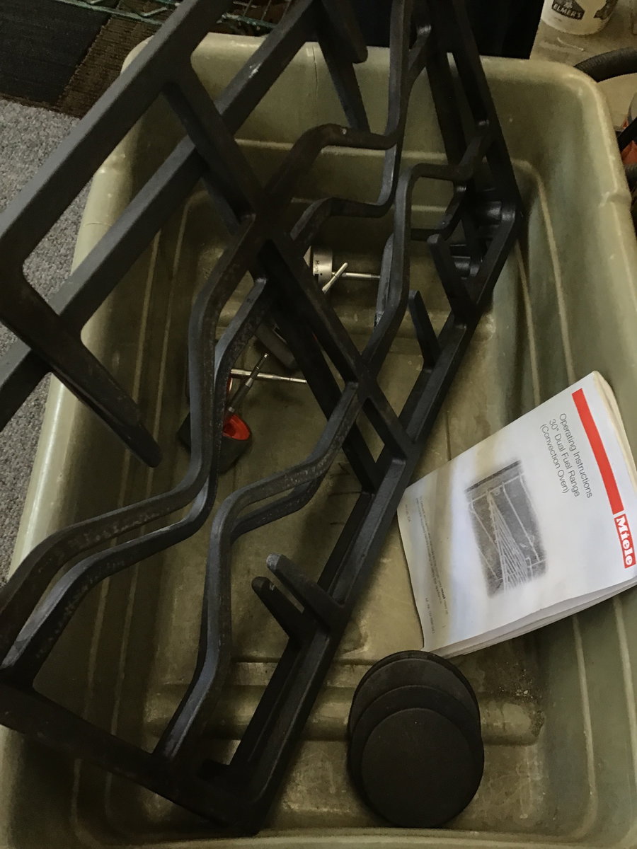 Newer and very slick Miele dual fuel range in great shape. Unsure of exact year of manufacture, but this model is still available on the Miele website. 4.59 cu. ft. capacity, has a water line on the back for their "MoisturePlus" feature, likely a steam sort of thing. Features a soft-close door and a swiveling handle for extra comfort when opening and closing. Gas has not been tested. One burner listed at 12,500 BTU, the others at 19,500. See this baby retailing here for $9,799!!