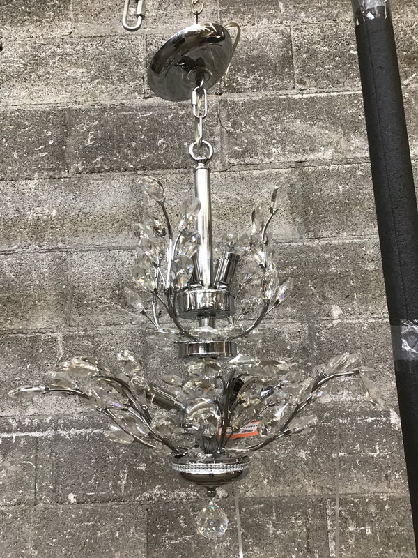 Fun 8-bulb chandelier featuring "crystal" branches stemming from a a shimmering chrome trunk. It's a little forest-meets-disco. Suitable for dry locations only.