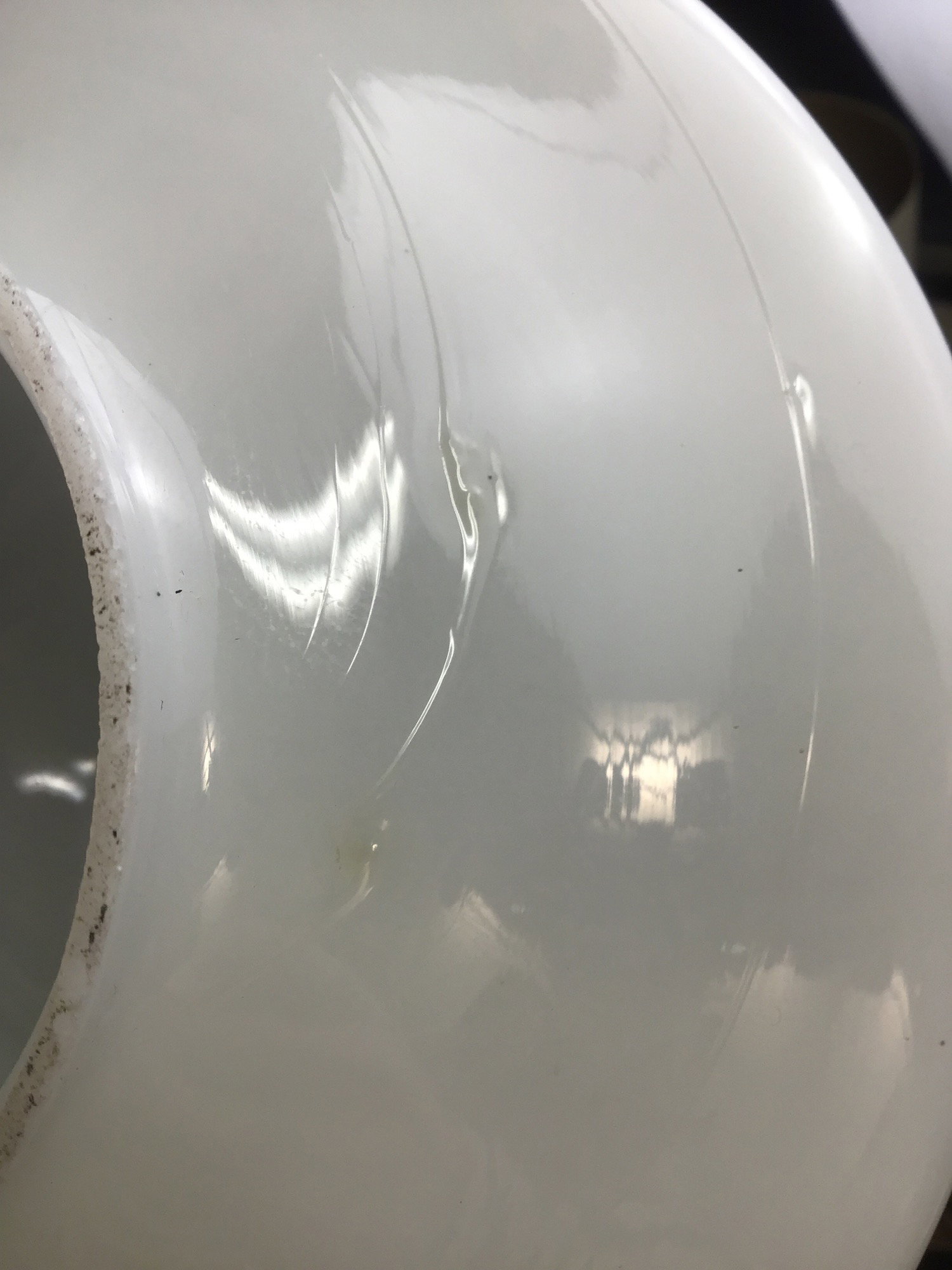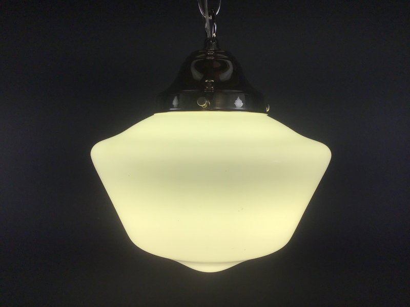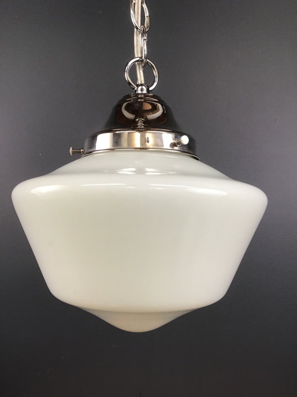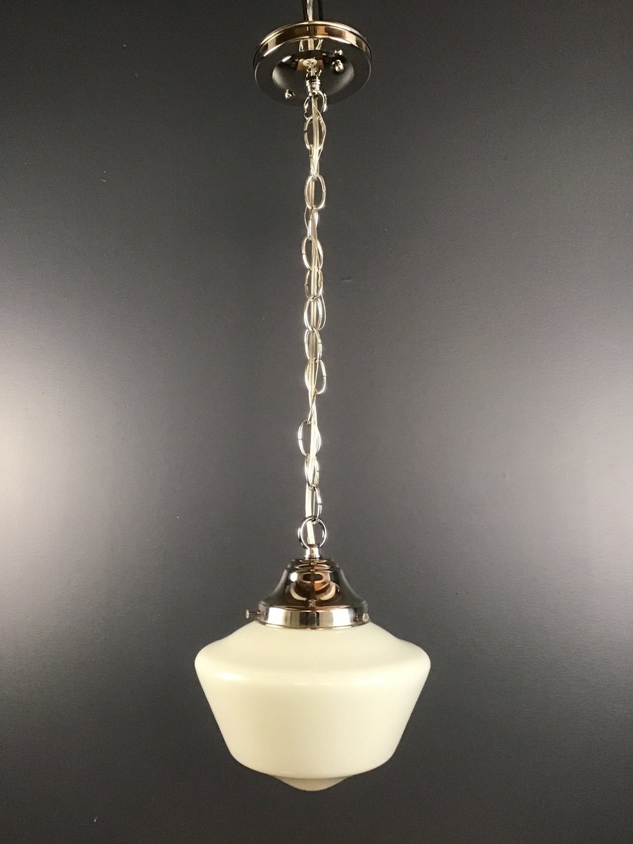 This vintage schoolhouse shade looks to be from the 1920s-1940s, as you can see and feel a bit of texture from the hand blowing process, rather than mold lines of a reproduction. The polished nickel plated canopy, fitter, and chain are new parts to match the era.