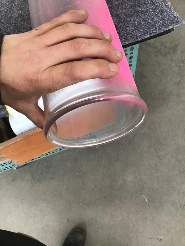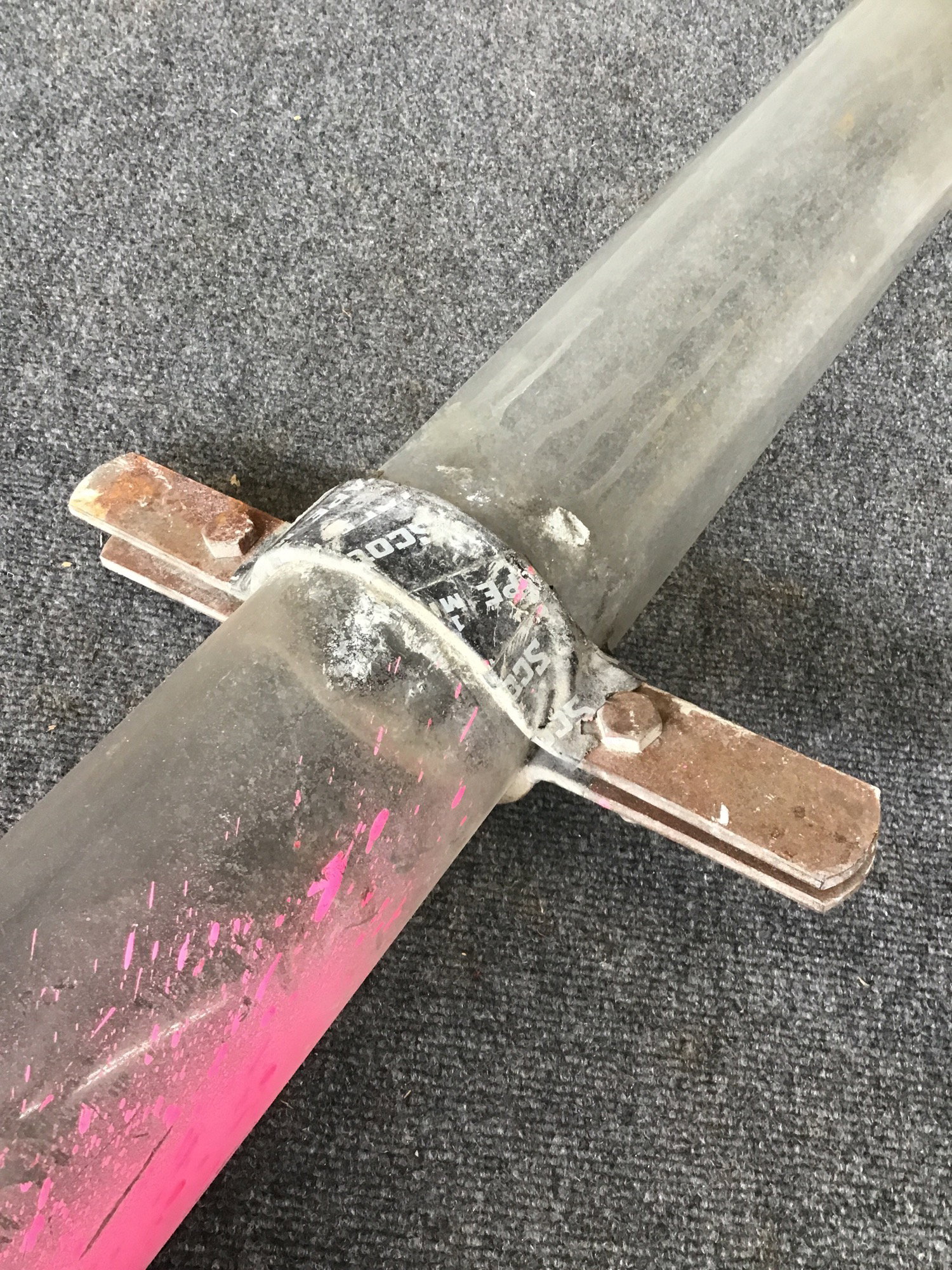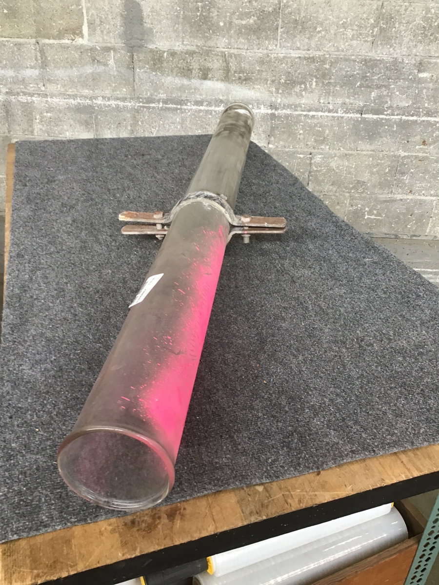 Very large glass tube with flared ends that resembles one of those old school drive through bank tubes. Includes an attached wall mount bracket. I don't see the PYREX label on this tube but other pieces that it arrived with are labeled. This was probably a drain for use with corrosives so please re-use with caution. ID is ~4"