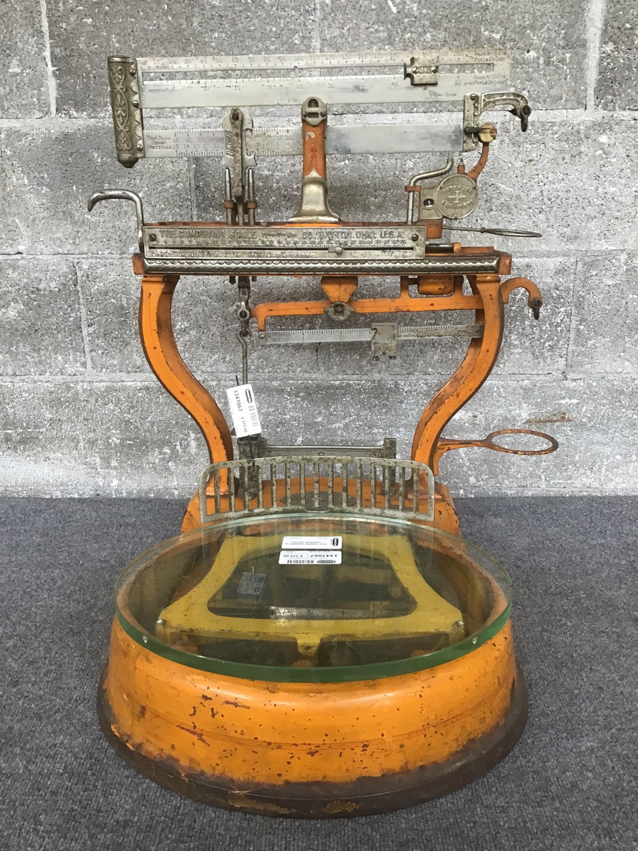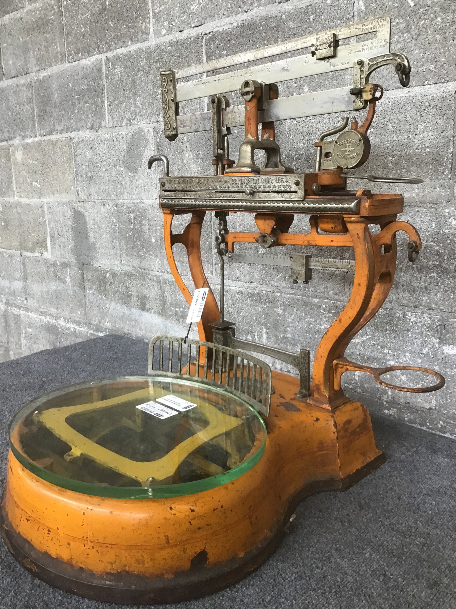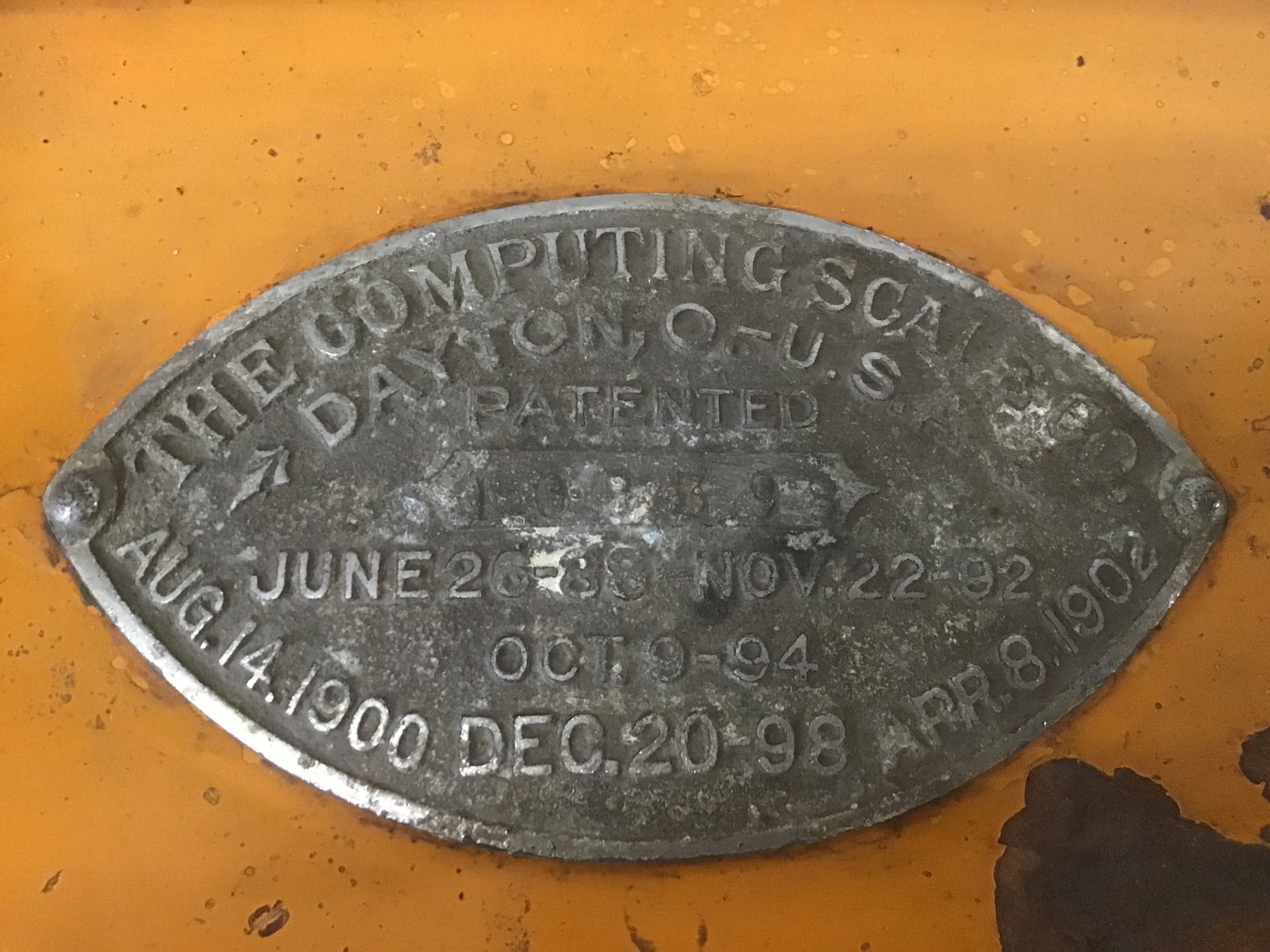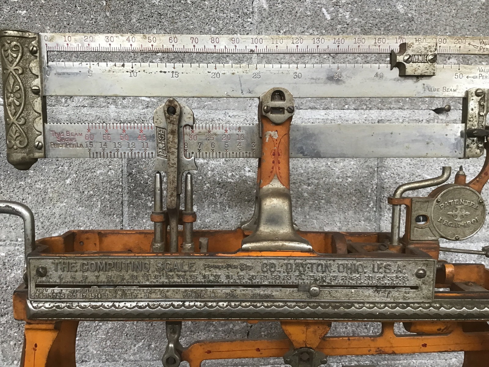This is an antique grocer's computing scale that was used for calculating per pound prices for groceries. This scale was most likely made in either 1900 or 1902 in Dayton, Ohio. Features solid cast iron construction, the scale arms have highly detailed and ornate metalwork throughout and a glass scale surface. The glass has some chips on it but no major cracks or anything. Comes with an array of tare weights.