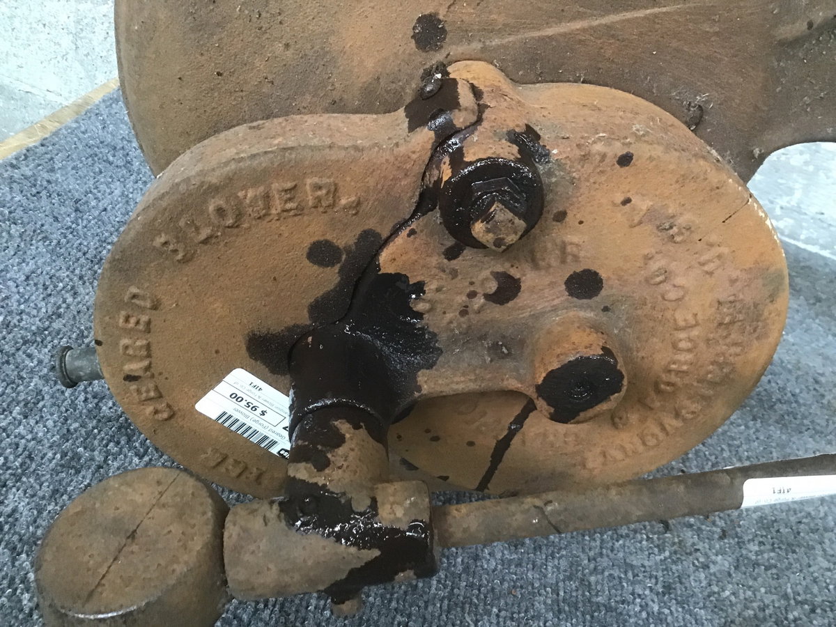 Vintage forge blower made by Champion Blower & Forge Co. of Lancaster, PA. This one is stuck and will probably need to be opened up and well lubricated. I was able to get the screws loose to access the top of the gear compartment, where there were plenty of cob webs to go with cedar and fir needles. The gears don't look bad. Seems like a good candidate for restoration. It comes with a post that adds about 26" of height to height listed. Dimensions are approximate.