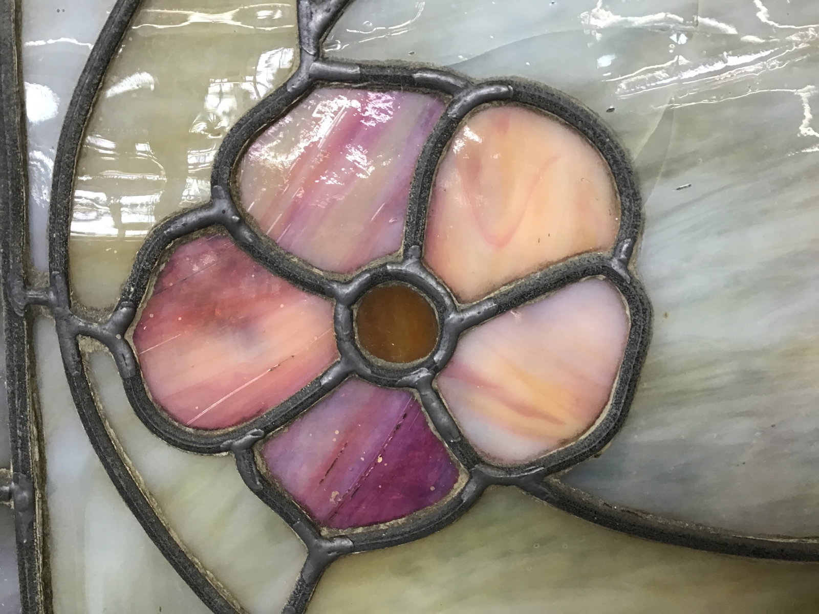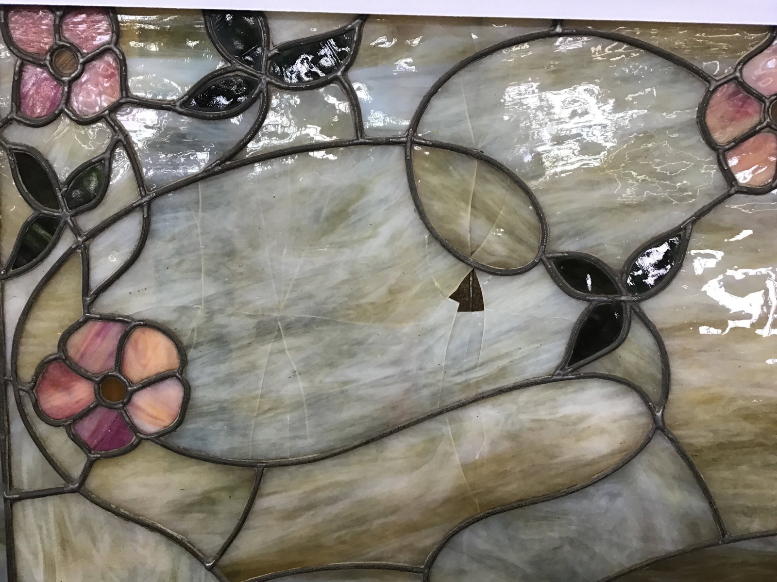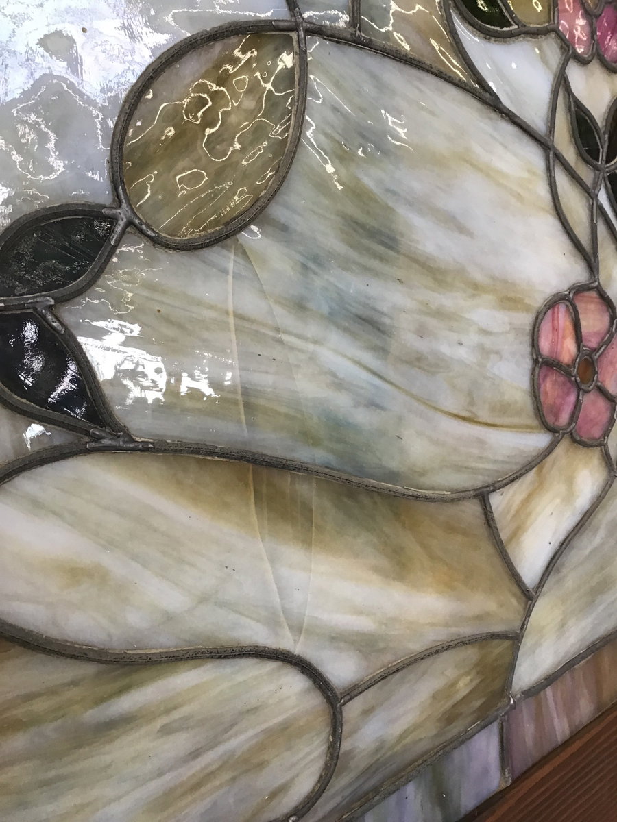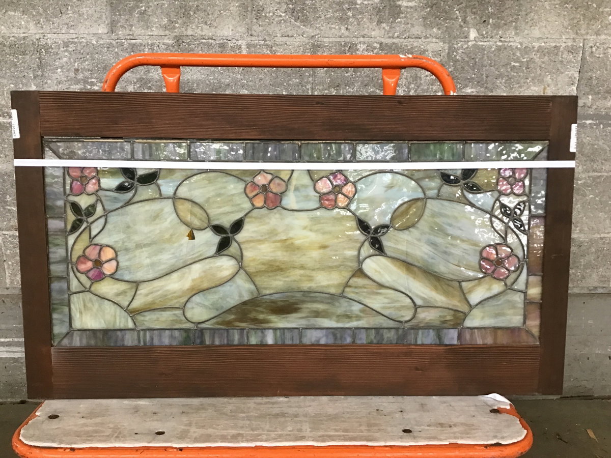 This is a slag glass art piece framed in a dark stained fir. The glass includes pink flowers and dark green leaves along with large cream colored panes. There are several instances of cracking and one panes is missing a piece of glass, price reflects.
