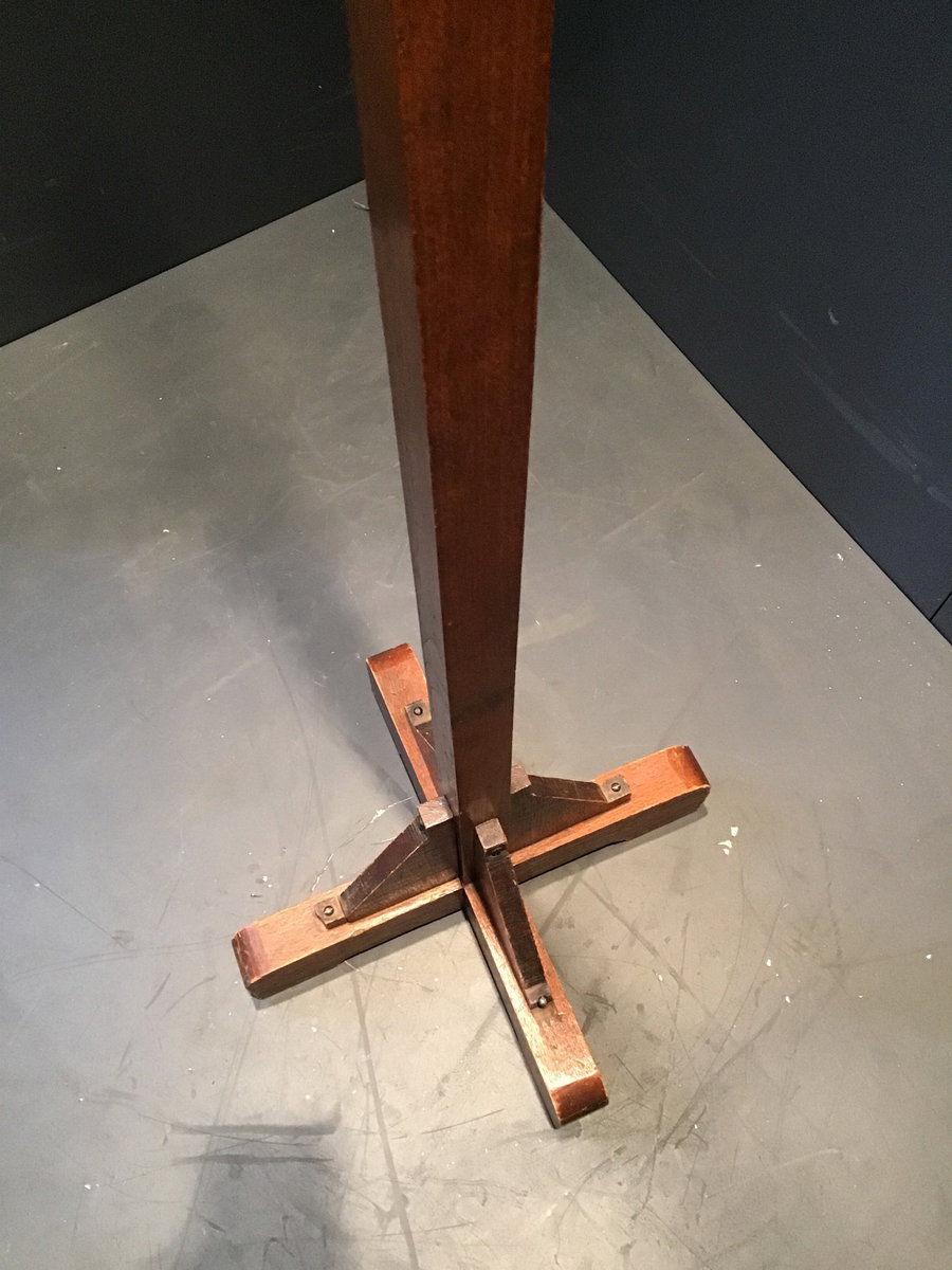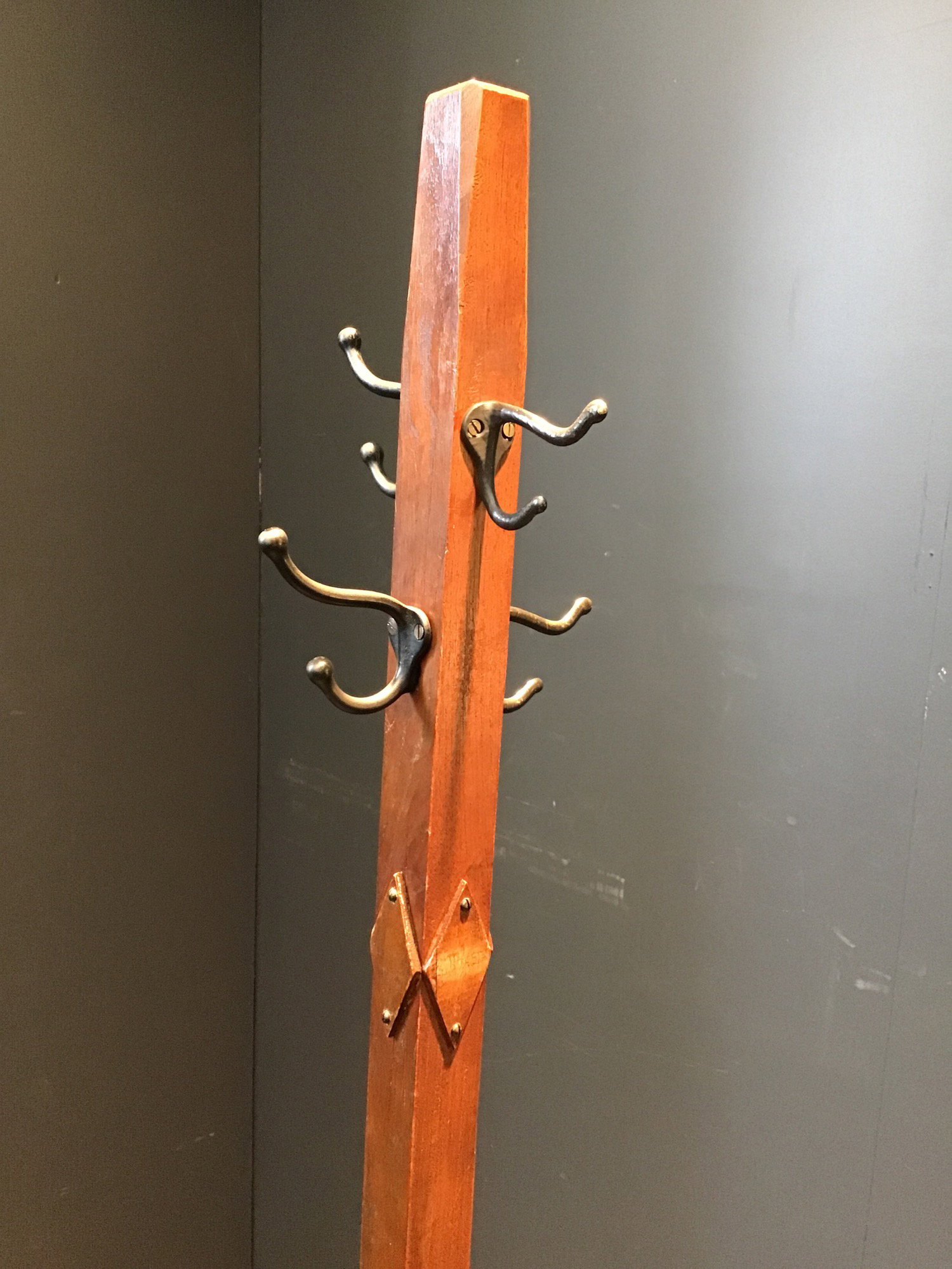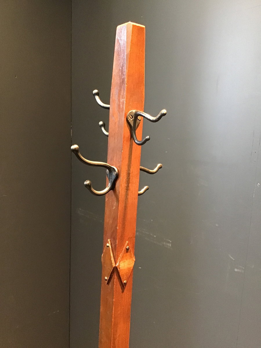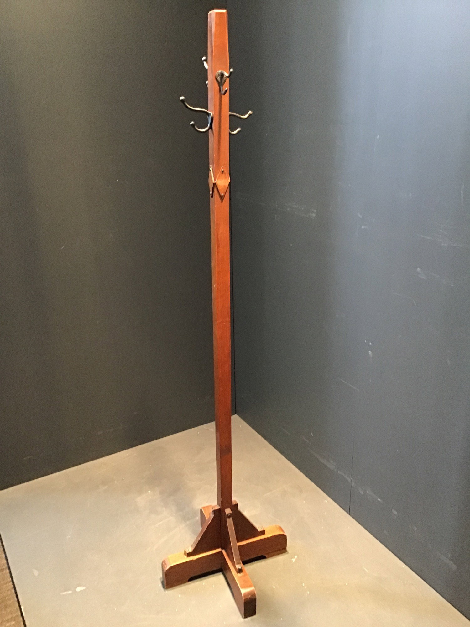 Simple and stately antique coat rack. From the early 20th century with four double pronged hooks to make for 8 potential coats or hats to hang. Nice diamond wood decorations and the top post has been tapered nicely.