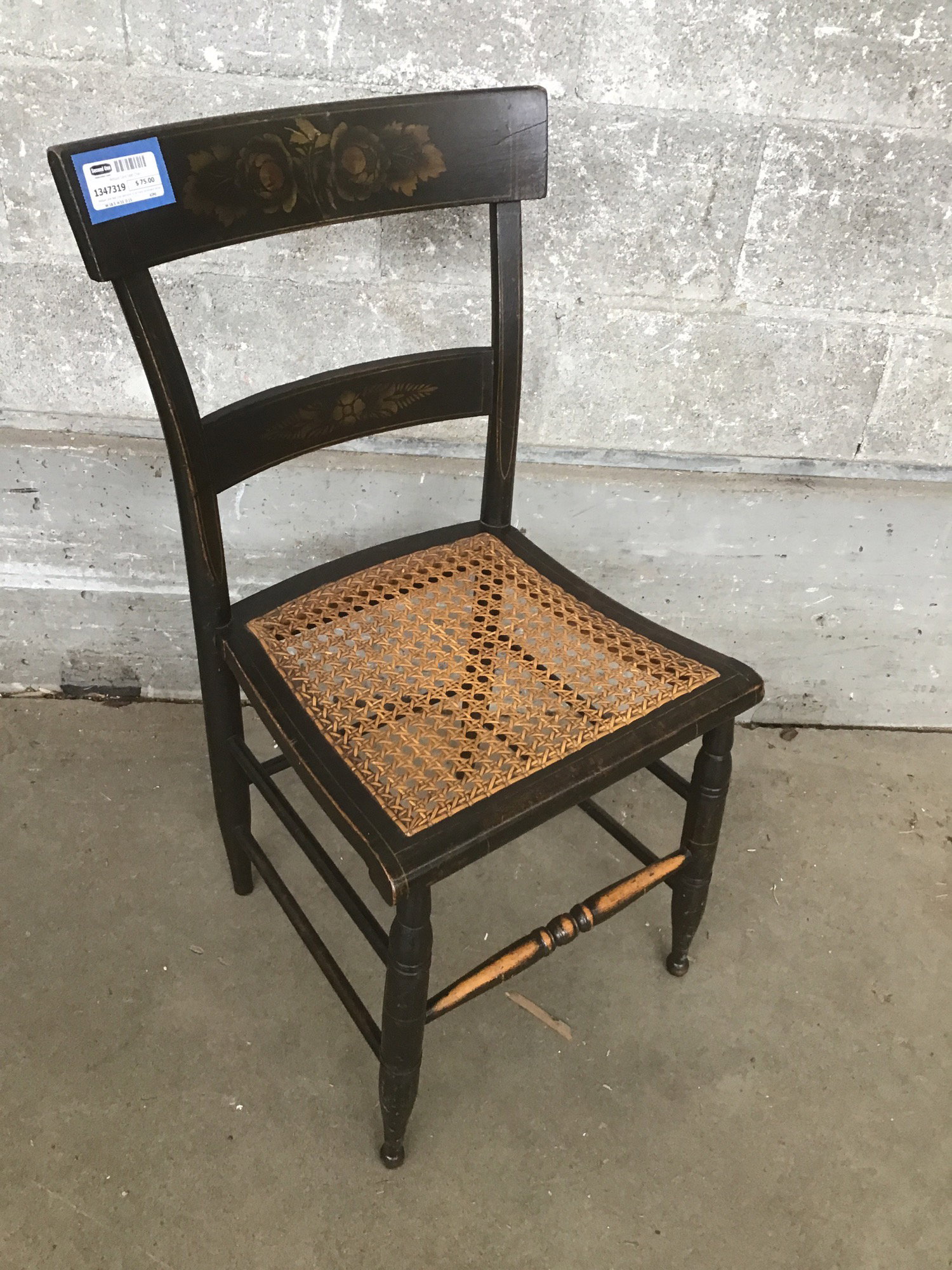 Antique Cane Seat Chair estimated to be made somewhere between the 1830s and 1860s. Two slat back and a braided cane seat. Unsure of wood species but painted a dark color and has some floral designs.