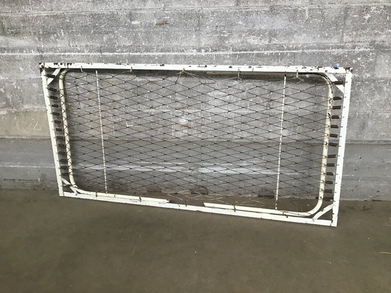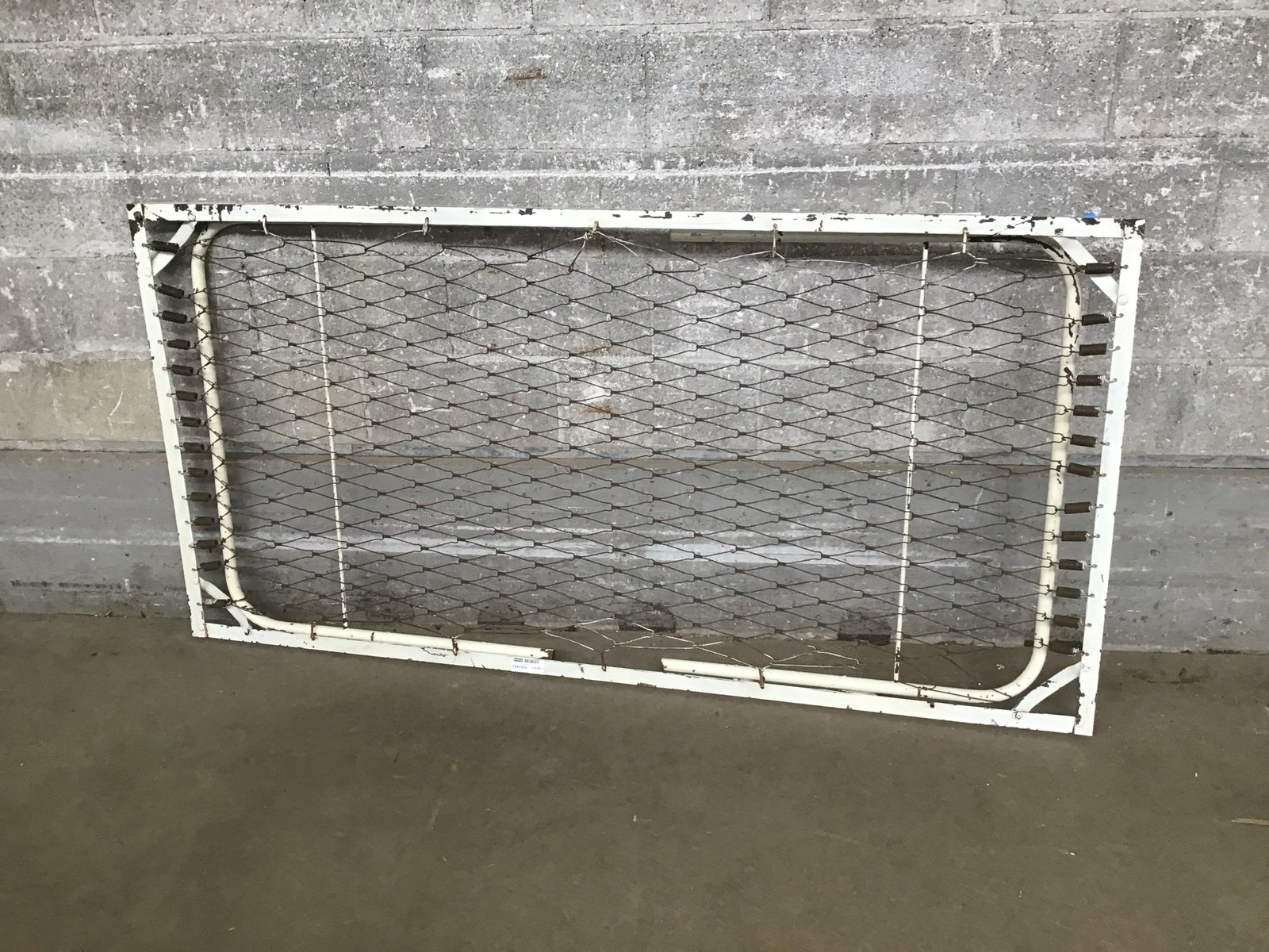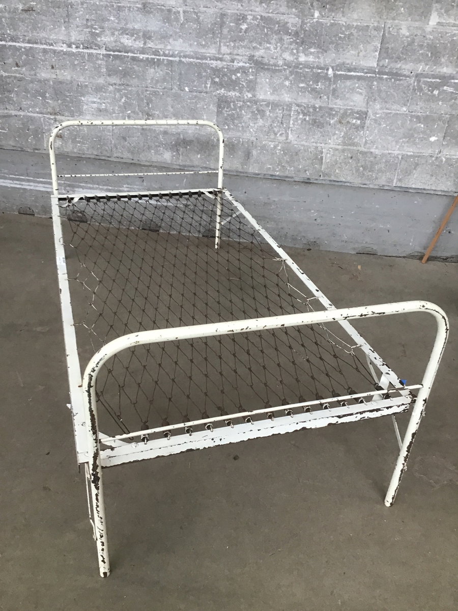 A vintage steel folding cot with bed springs across it. It looks to be in good shape, but you should still USE AT YOUR OWN RISK.