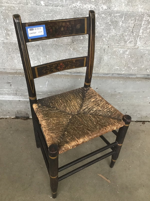 This is an antique wicker seat chair likely made in the mid 1800s. Features two slat back with floral designs and a wicker seat that is still in decent condition.