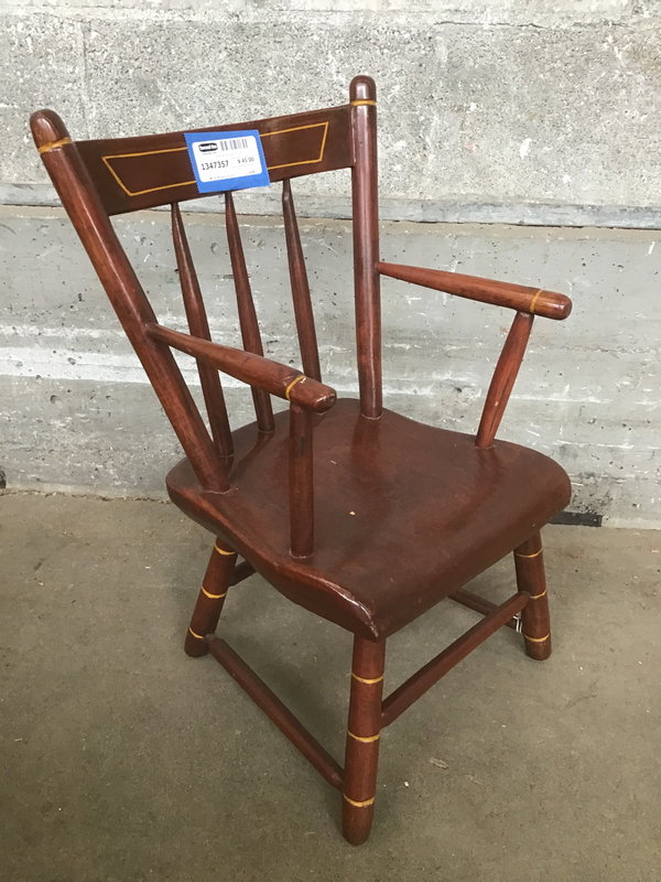 This is an antique children's chair made in the 1830s by John Wilkes Eddy in New York. Made from solid wood, it has some subtle yellow painted detail lines. Stained with a medium-dark stain.