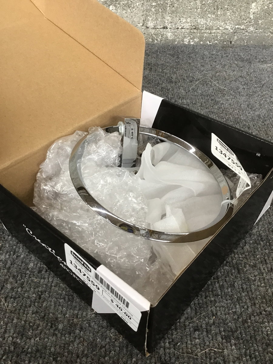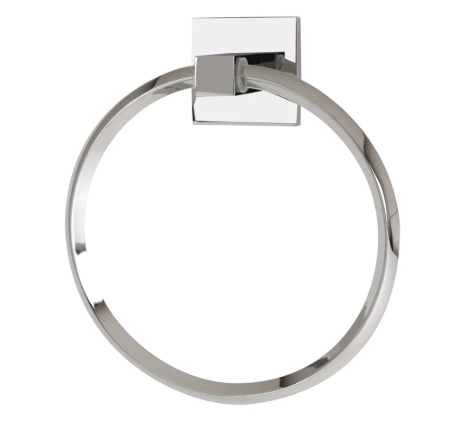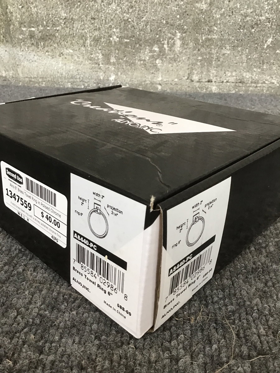 A solid brass towel ring with a shiney polished chrome finish by brand Alno. Arrived in excellent condition in original packaging. Photo is representational. This looks to retail new for $87.96.
