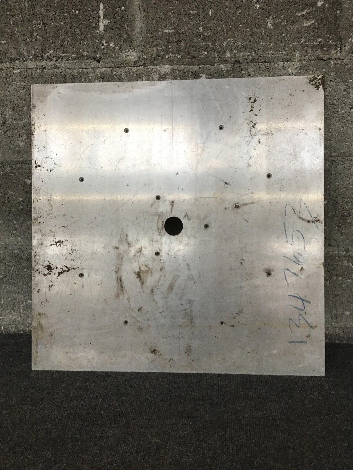 3/16" Thick aluminum plate with a 1 1/2" diameter center hole and a few screw holes.