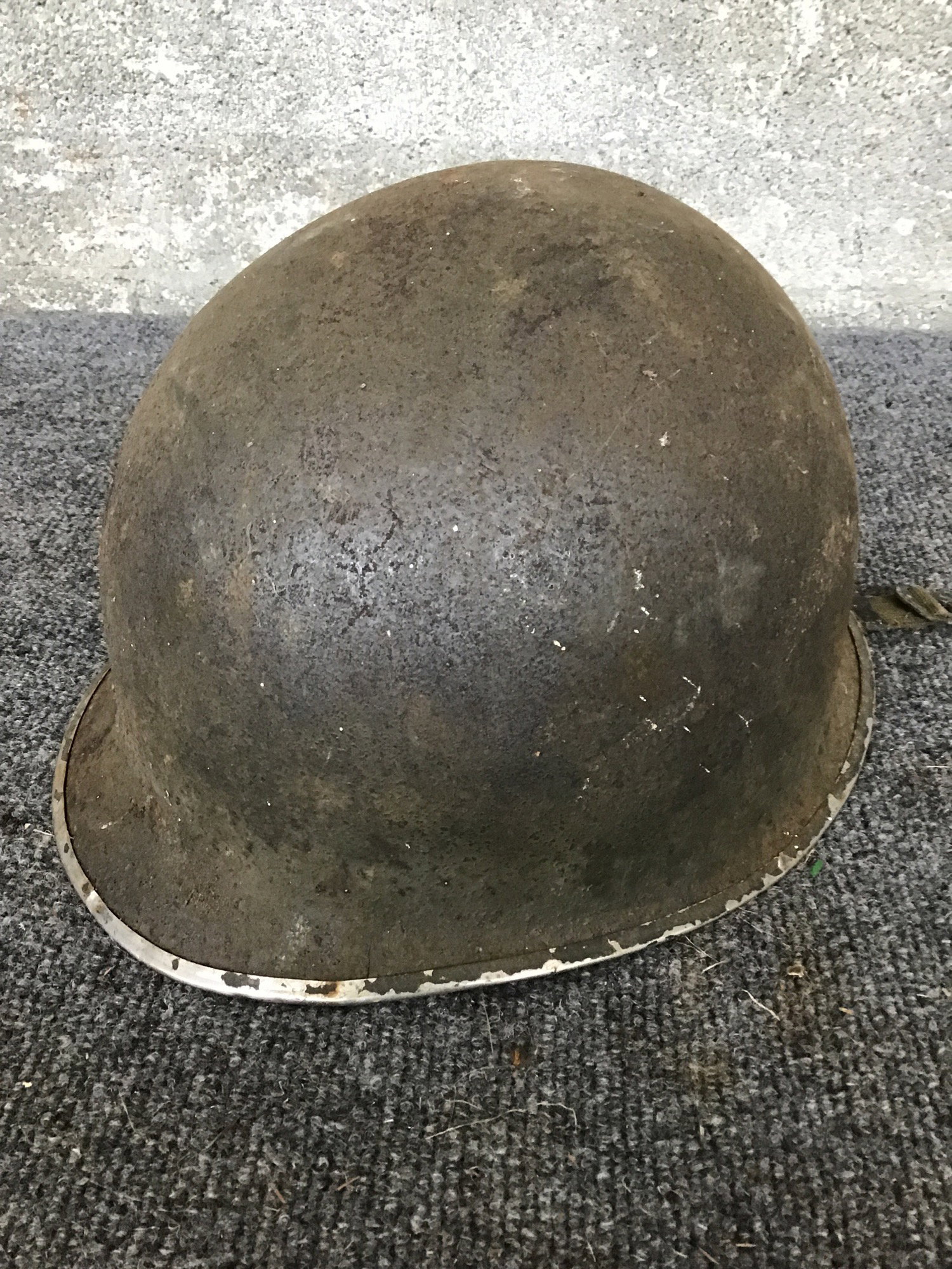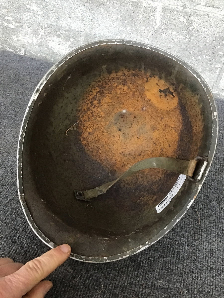 I believe this is a U.S. M-1 military helmet of WW II era that's jsut a "steel bucket" at this point. There's no harness/liner inside, no any way to attach one. Still has chin strap. Has some rust coming amongst the green paint.