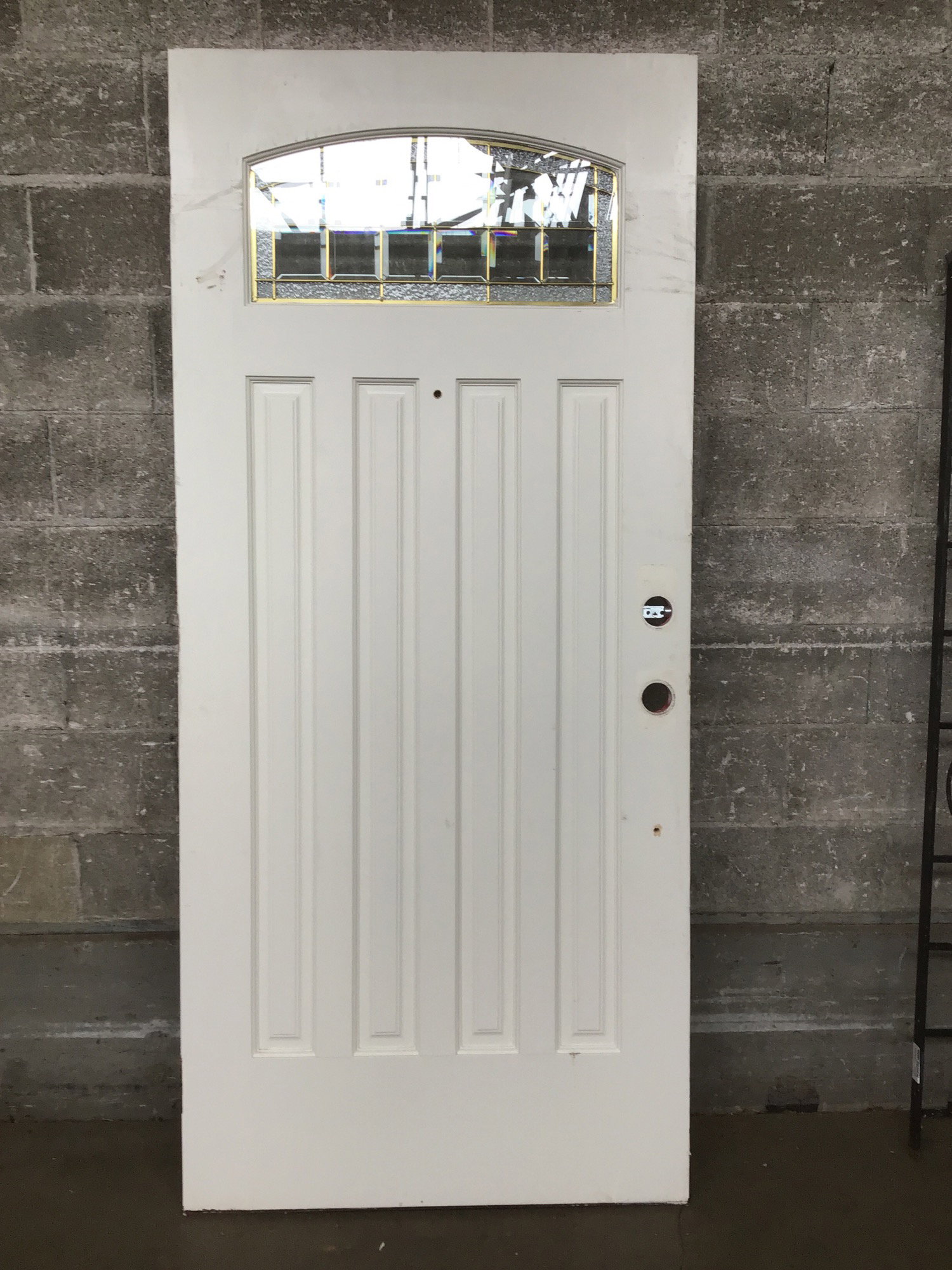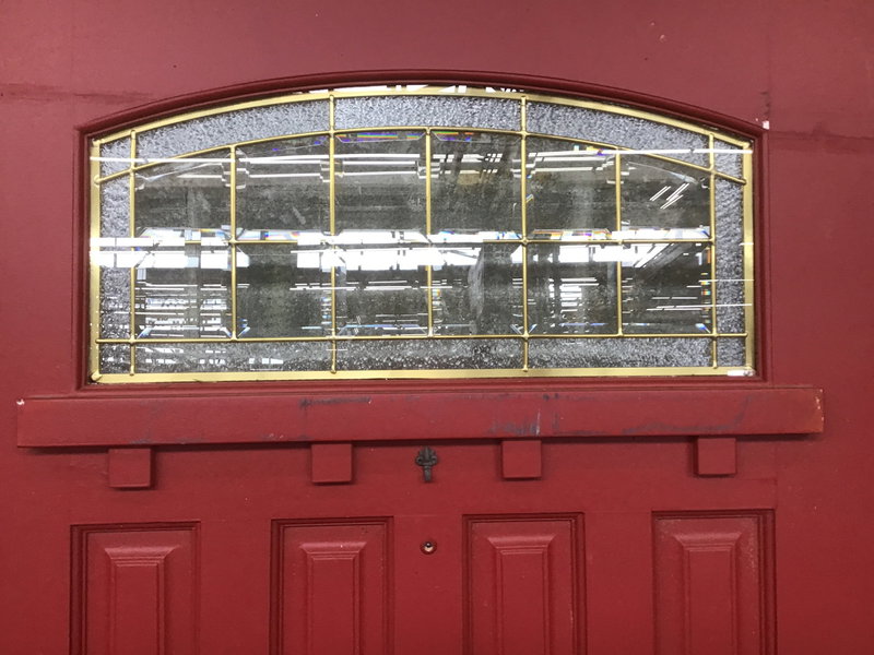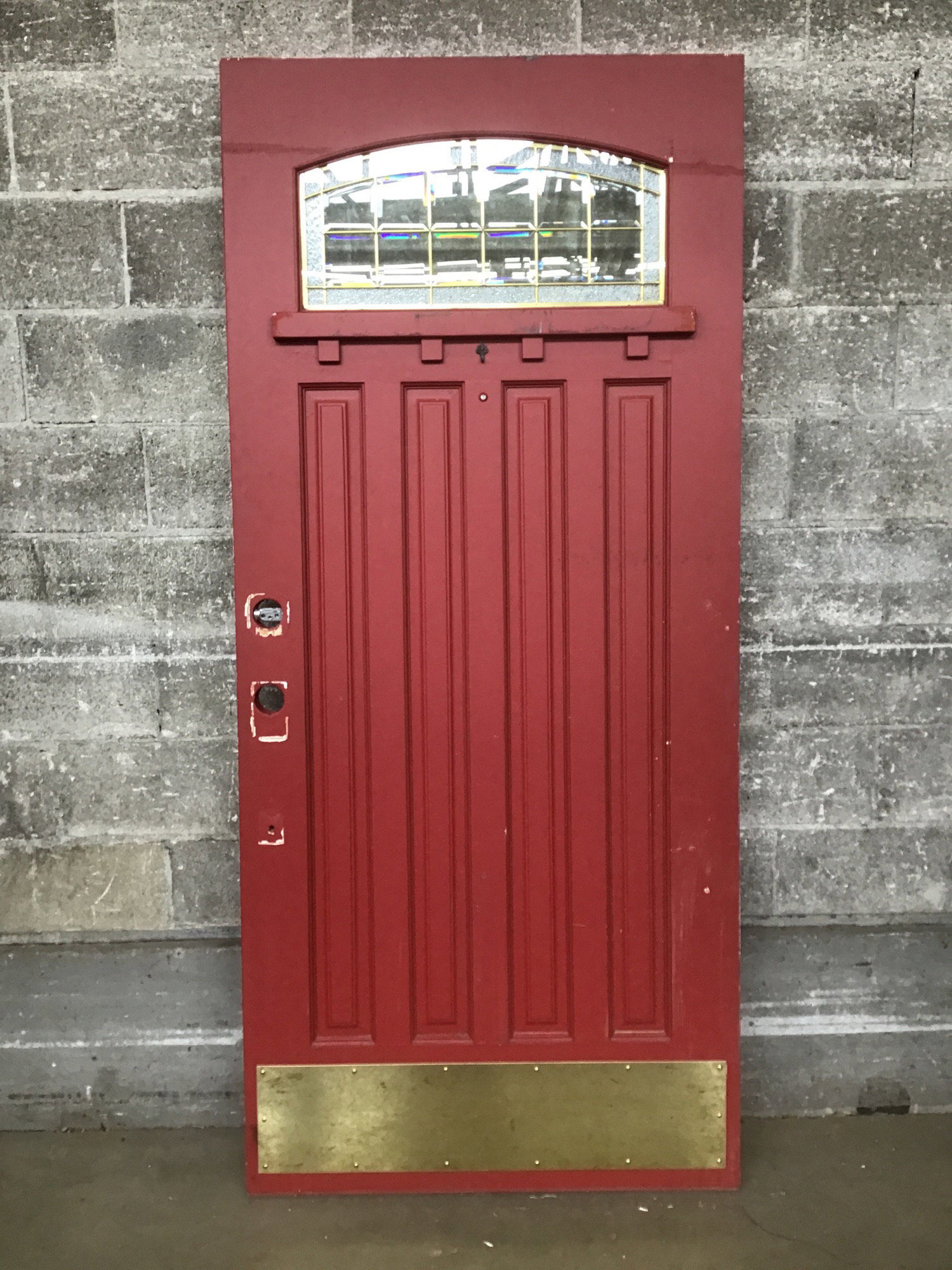 This exterior door sports four raised vertical panels under an insulated, leaded glass (brass caming) lite up top.