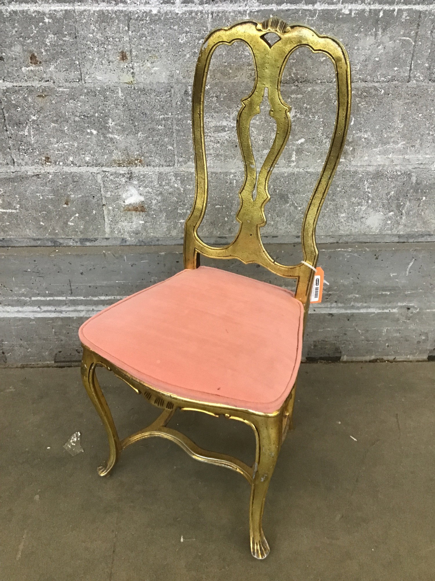 Unlabeled, but appears to be a gilt aluminum dining chair by Arthur Court Designs. Dusty rose seat cushion.