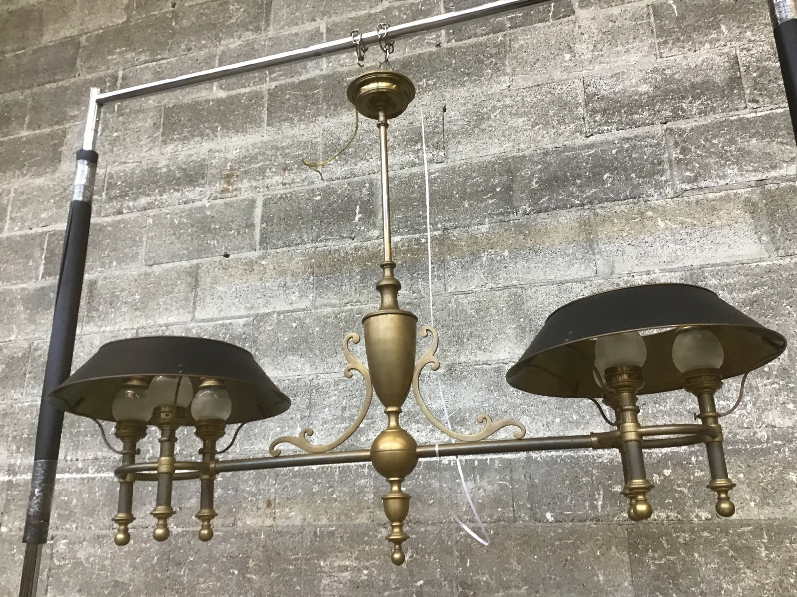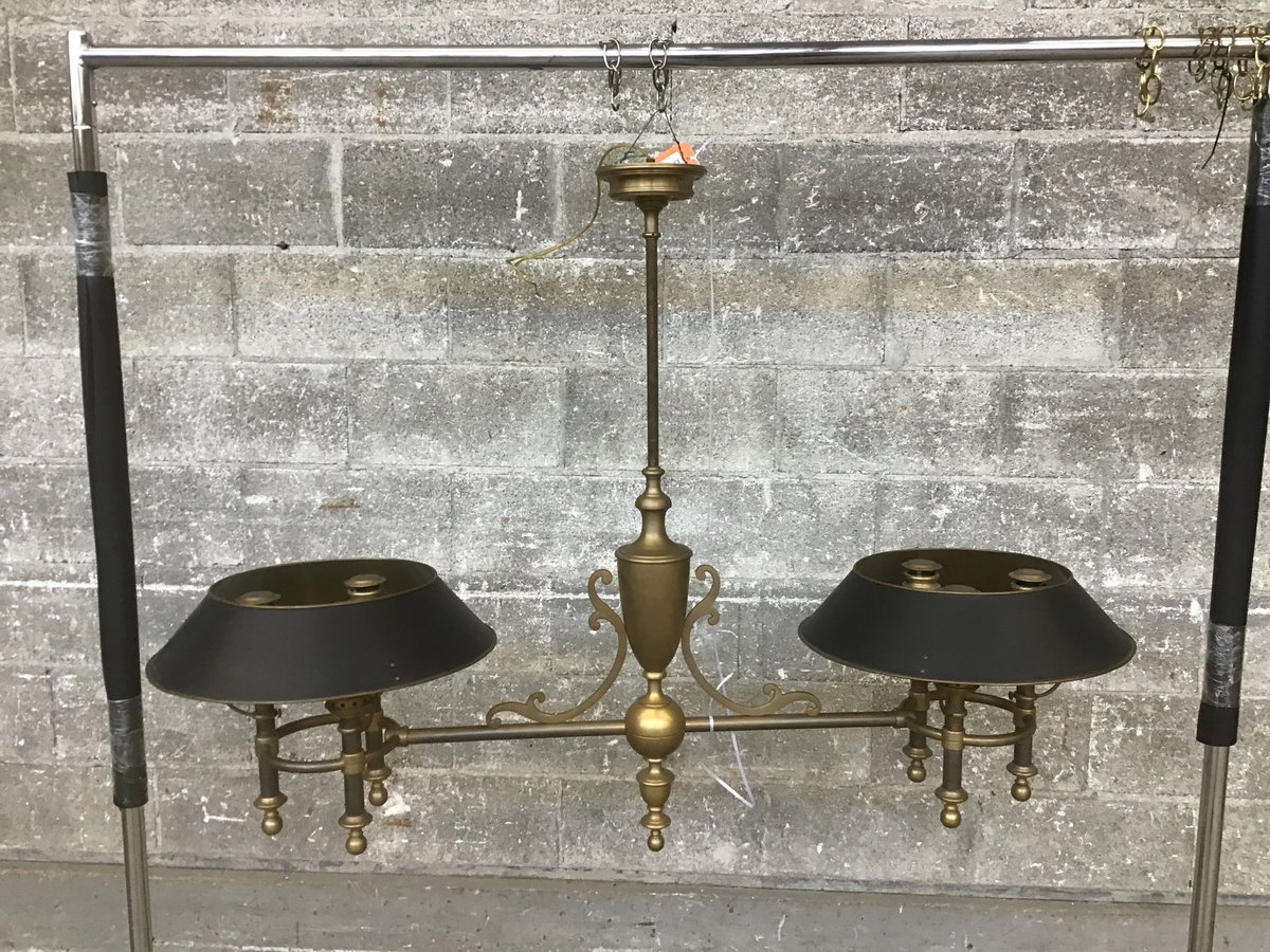 Stunning Double Billiard light by E.F. Chapman. Model 801AE, from 1972. All-brass frame, with metal shades and nautical style lamp covers. Traditional Georgian styling.