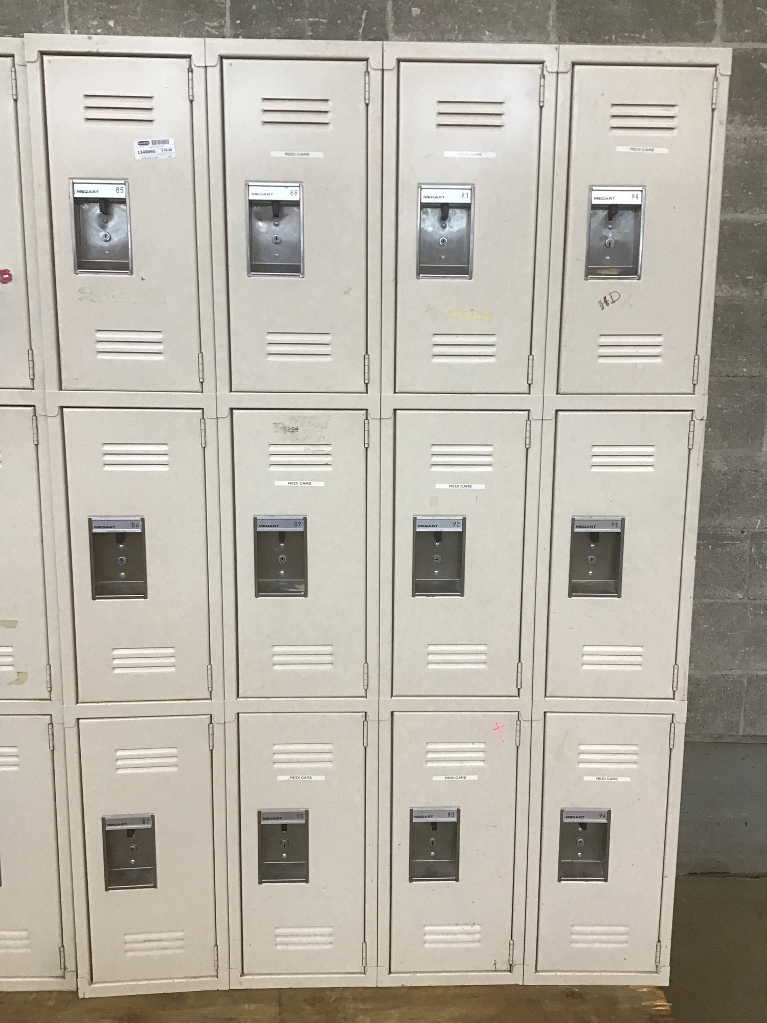 A metal bank of lockers with a painted beige finish. We were unable to open 1 of the doors on this one and the price reflects.