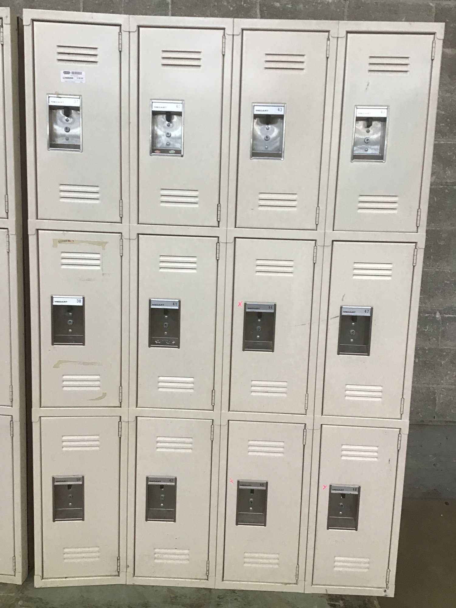 A metal bank of lockers with a painted beige finish. We were unable to open 3 of the doors and the price reflects.