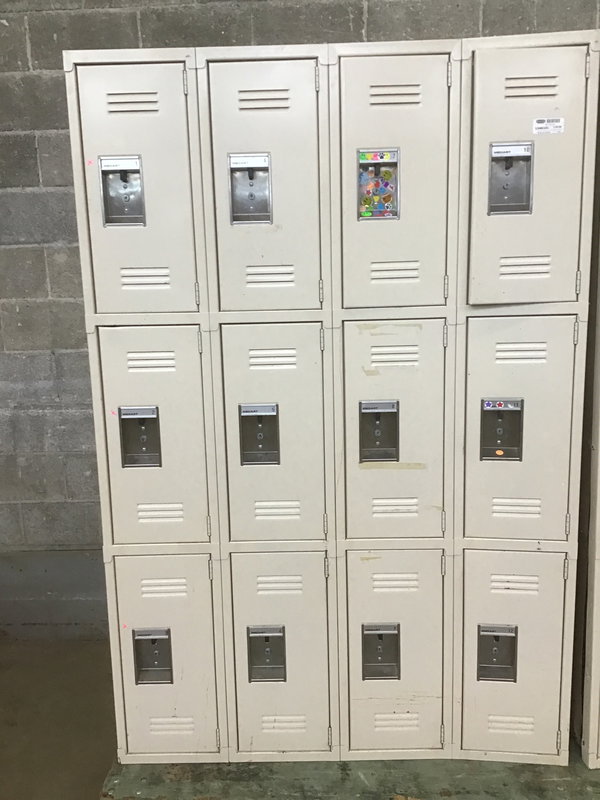 A metal bank of lockers with a painted beige finish. We were unable to open 2 of the doors and the price reflects.