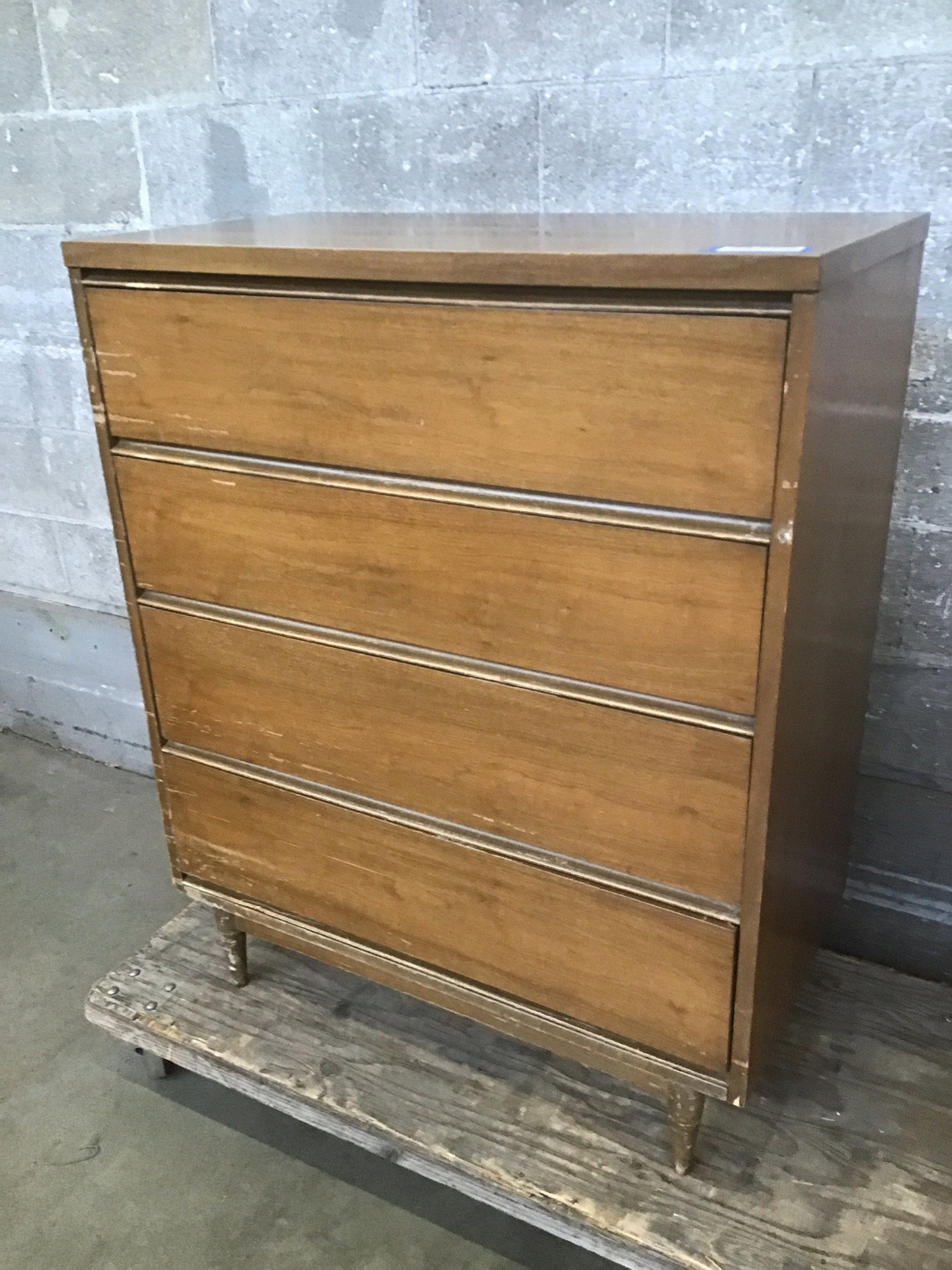 This mid century modern dresser features a solid walnut wooden frame and has four drawers for storage space. It does have some wear but it has good bones.