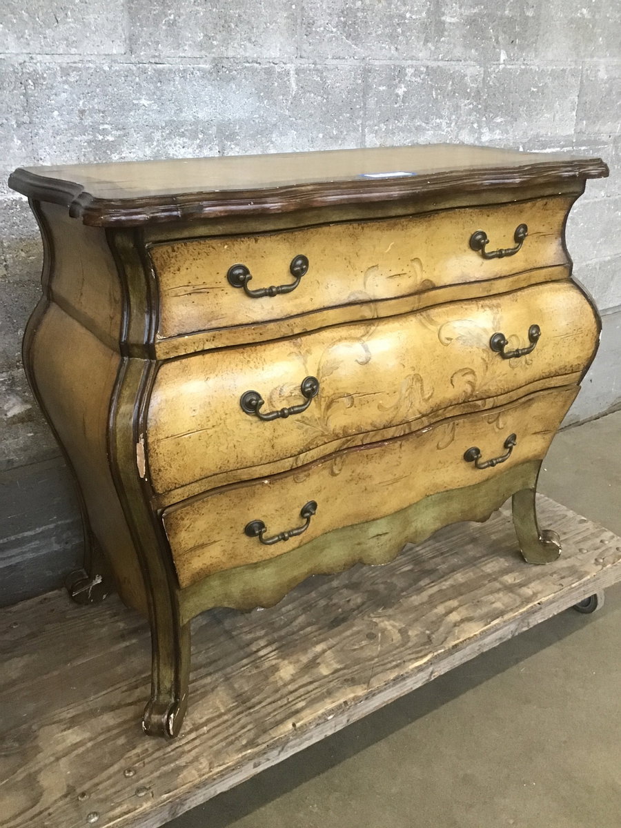 This is a Bombay chest style dresser with 3 drawers and a distressed earth tone finish. Very curvy. There are bits of wear here and there, nothing major though.