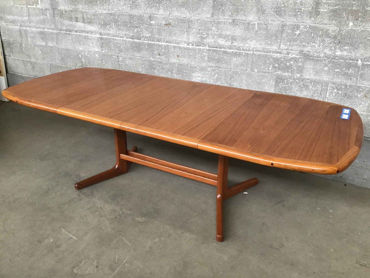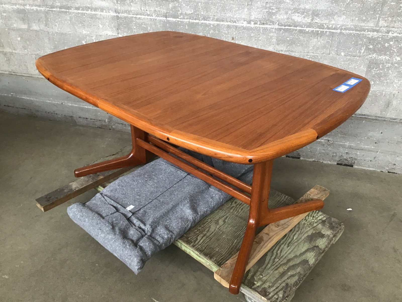 This extendable dining table from D-Scan is the epitome of midcentury modern design! An angular trestle base, softly rounded rectangular top, curved edges and rosewood finishing dowels elevate the iconic warm-toned teak we all love in Scandinavian midcentury design. Manufactured in Singapore for Diethelm Scanstyle (D-Scan), this table's fine craftsmanship (with the help of a recent refinish) is sure to make it an anchor of style in your home for many years to come!