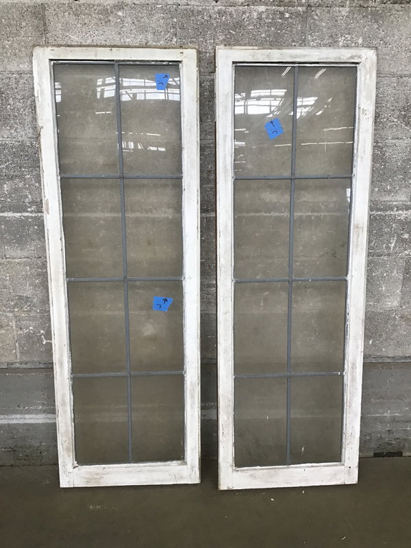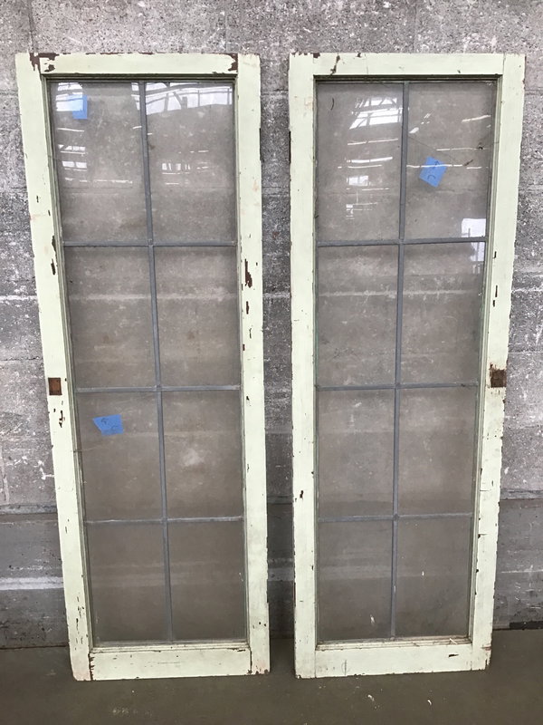 A vintage wood window sash pair from an old-school hinged window. They're in decent structural shape, definitely aged, each with eight panes of wavy glass leaded together. Some of the panes have broken, which the price reflects.