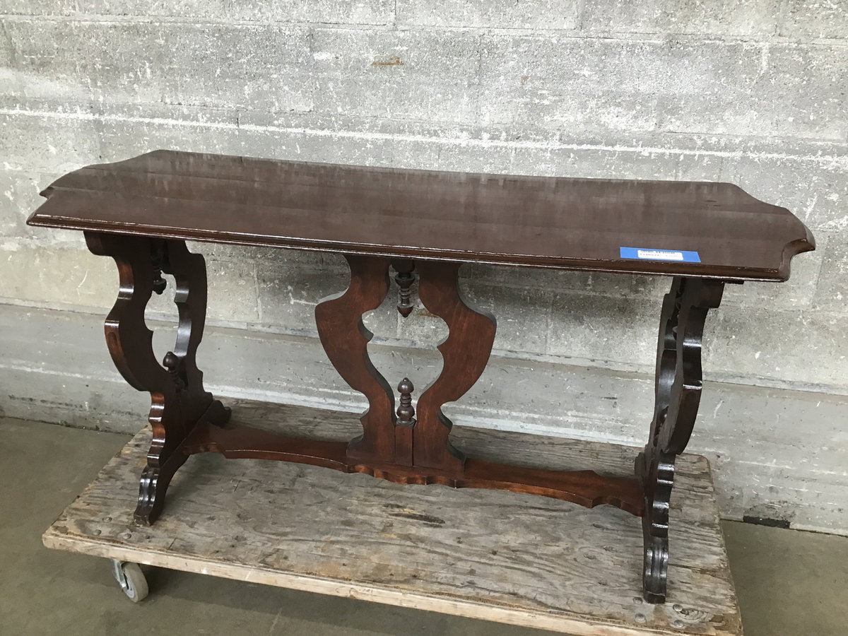 An elegant entry/console table likely circa late 1800s. Has sort of lyre-esque legs and center column with handsome turned spindle accents. The top has a thick, glossy lacquer-like finish, but the legs and underside reveal the original finish in lovely coffee tones. Structurally sound, this table is perfectly functional as-is, or might be a good candidate for refinishing to bring back the old soft luster.