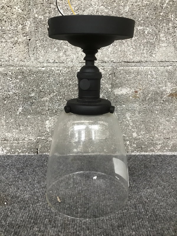 A simple little ceiling light with a clear glass fitter around the bulb and a matte black finish to the canopy and construction. It has a little turn-switch on the body of the light- no wall switch required!