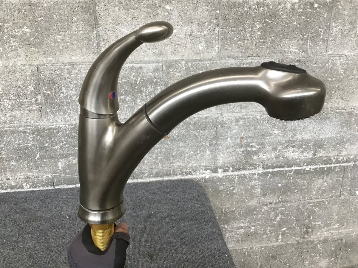 A typical kitchen faucet by Delta from their Cicero line with a stainless steel finish. Looks to be in good shape, just a little bit dated. Retailed new for about $315.