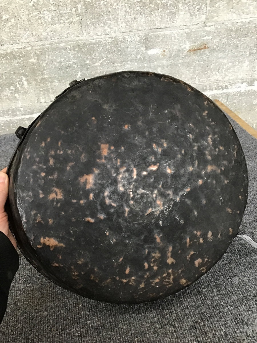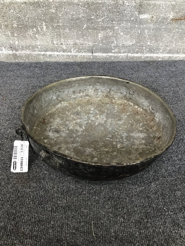 An interesting tin(?) lined copper pan of indeterminate age, though it's rather rustic/primitive so I'd lean towards antique. It has a pair of riveted loops on either side that used to hold handles. This ol' gal is delightfully well worn, with a bumpy hammered, heavily patinated (some might even say crusted) surface and charmingly deformed shape. It'd be a lovely addition to your garden or patio decor!