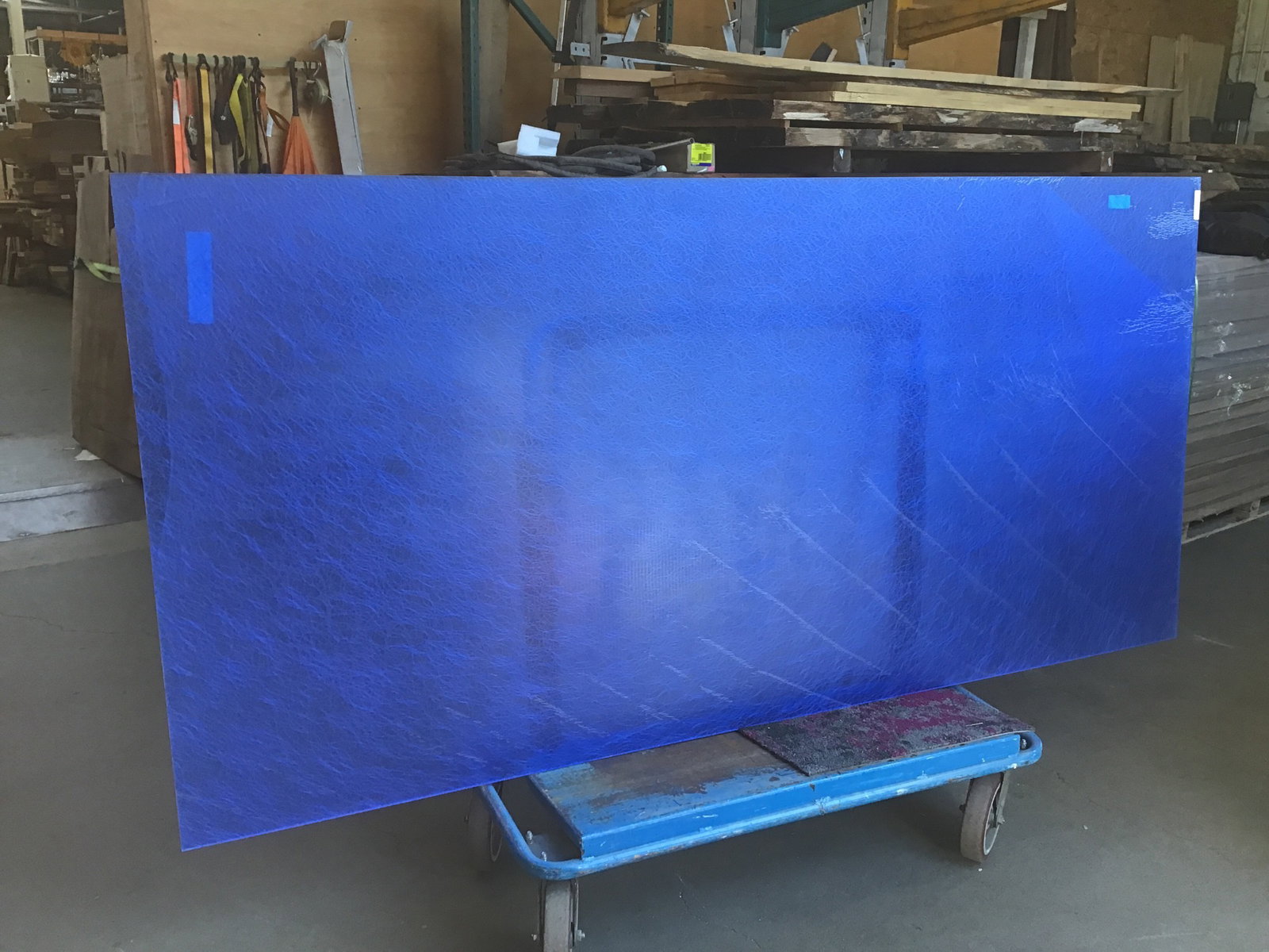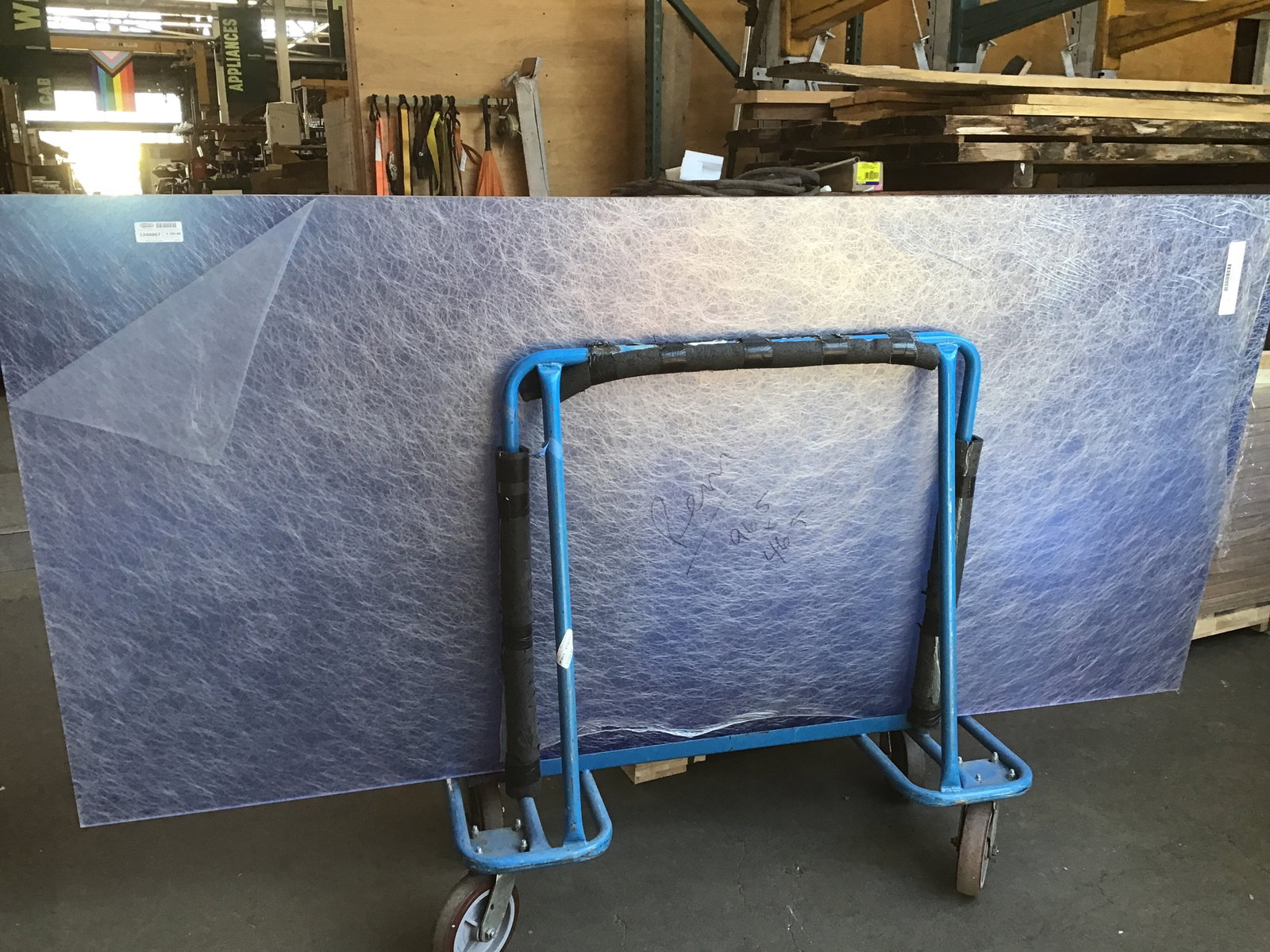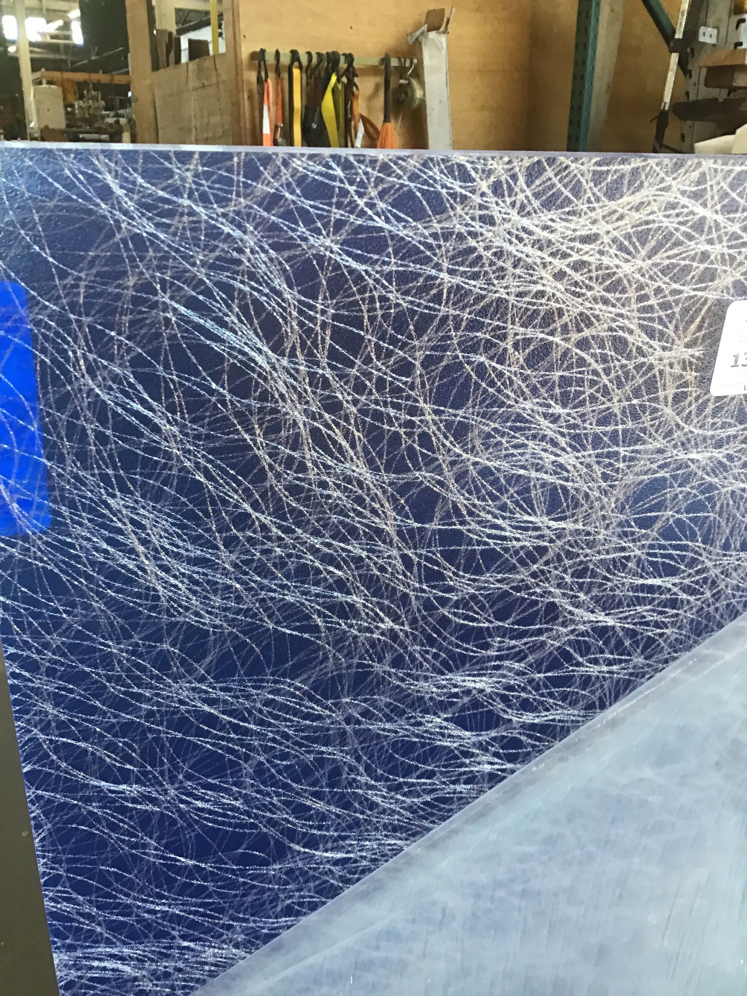 This high end 1/2” thick 48"x96" acrylic sheet in a "Silver Spun Lumiclear" has a white spiraly pattern has a deep blue opaque background and looks great! It still has the plastic film on it. It’s a remnant from a commercial project, produced by Lumicor. This sheet retails for over $2000, but you can get it for a fraction of the cost. Photo may be representational.