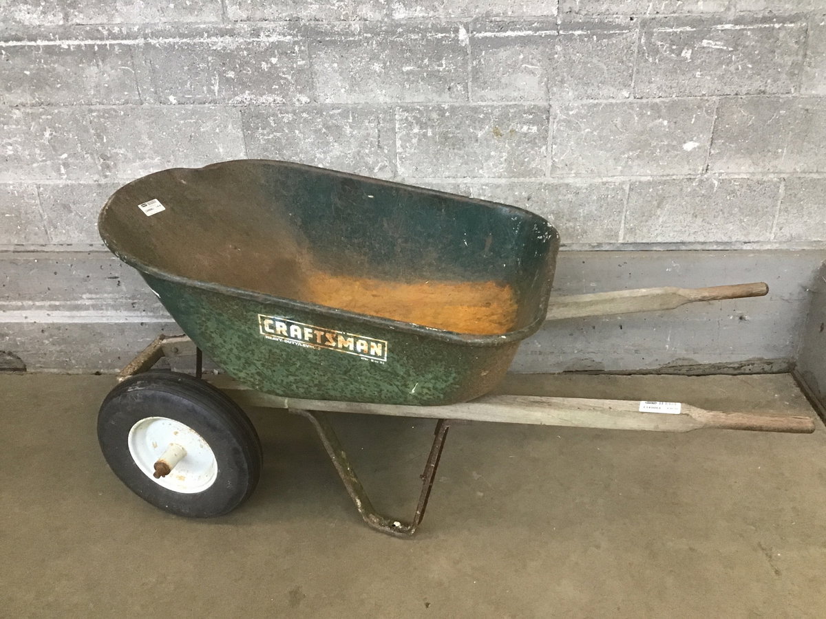 Dual Wheel Wheelbarrow from Craftsman. There is some surface rust and a dent in the front but still very usable.