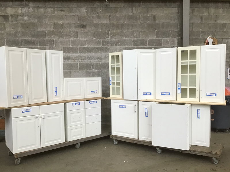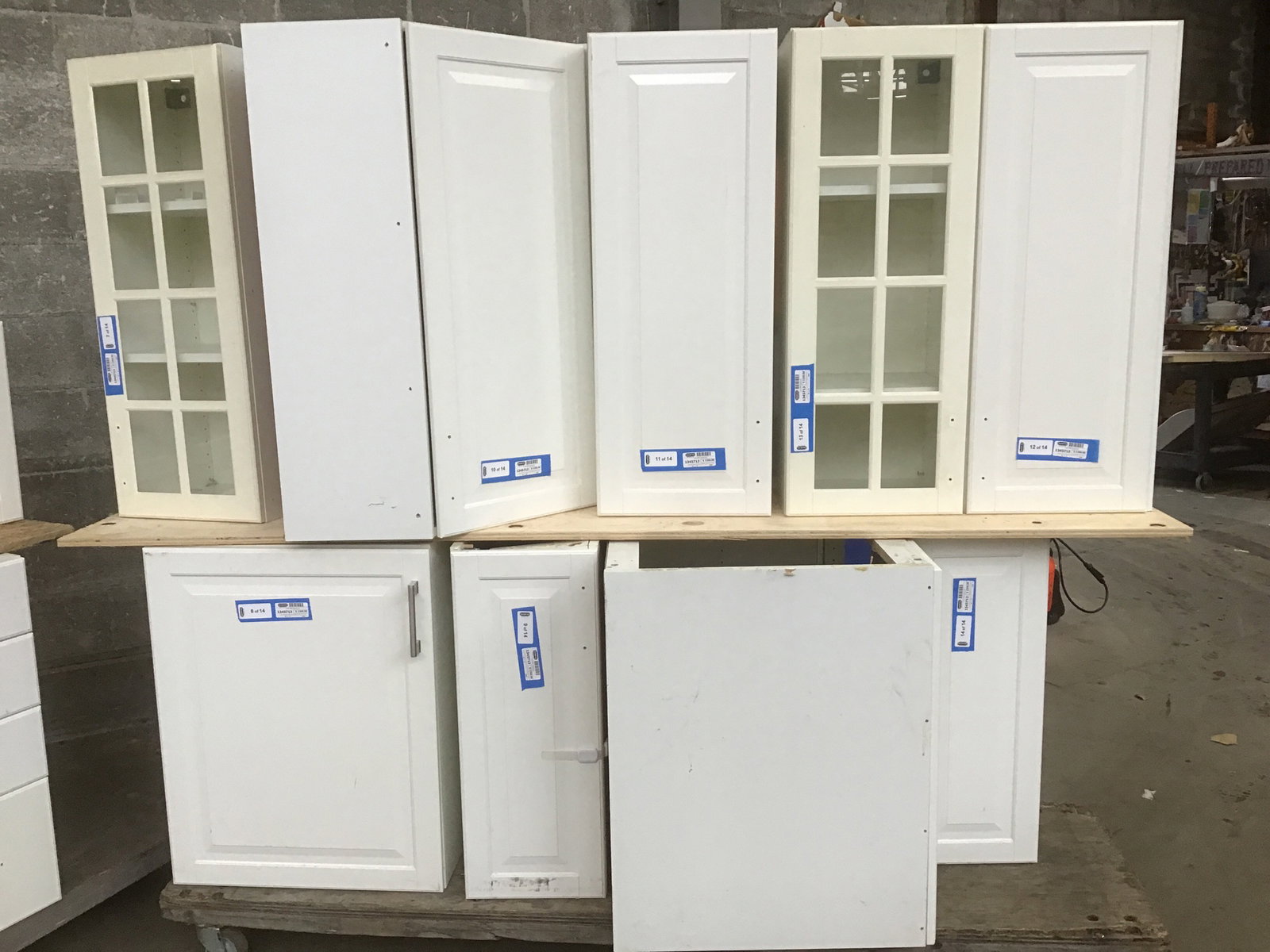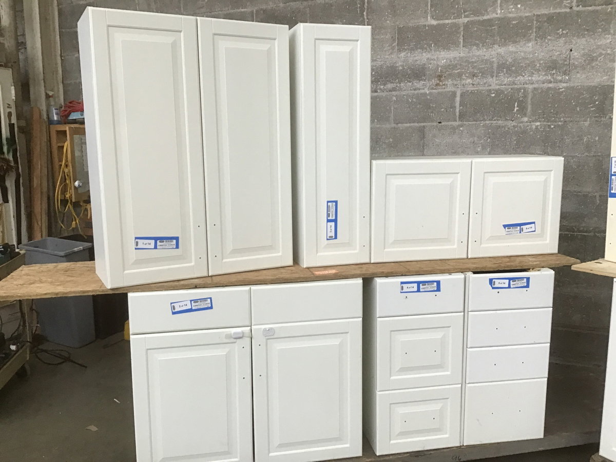 A set of fourteen raised panel cabinets by IKEA with a white plastic laminate finish. Features six bases and eight uppers, two of which sport glass doors. Many of the uppers and some of the bases feature adjustable-height shelving inside. The pulls have all been removed, but I have an idea where you might be able to find some...
