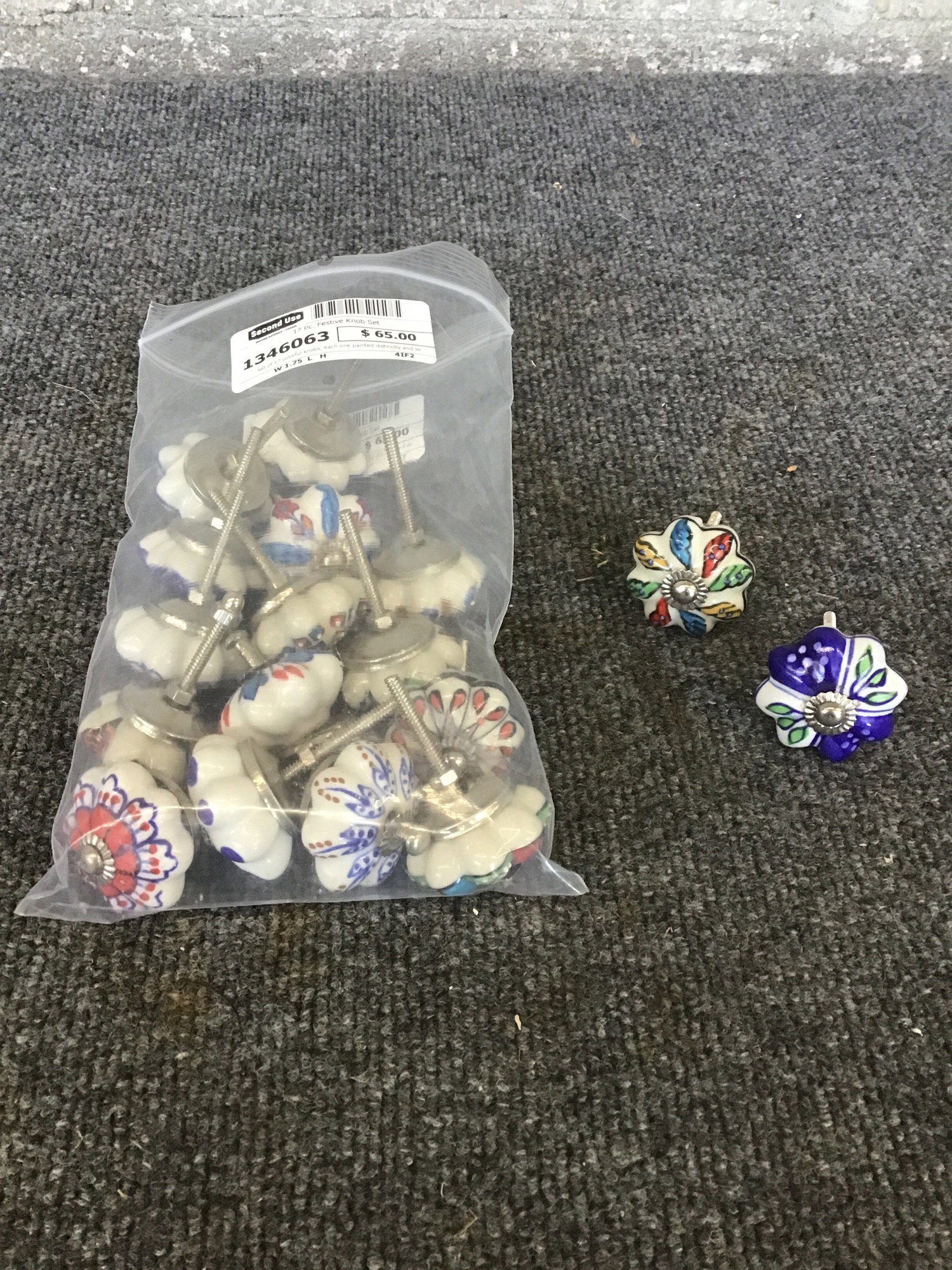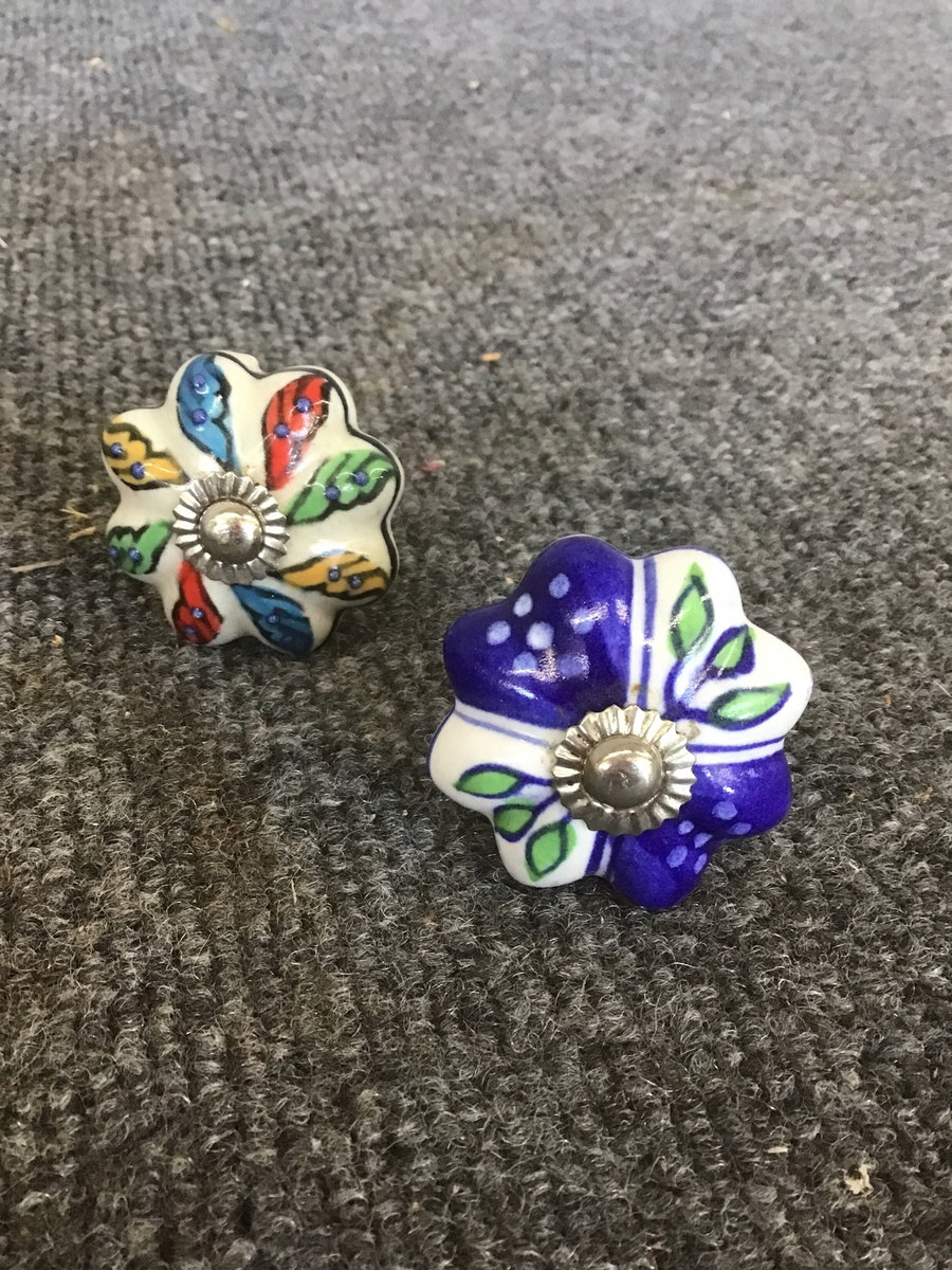 Set of 17 colorful knobs, each one painted distinctly and with some unique geometric+floral design. Give your cabinet set a quick, fun facelift with this happy knobset.