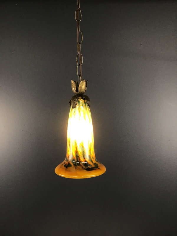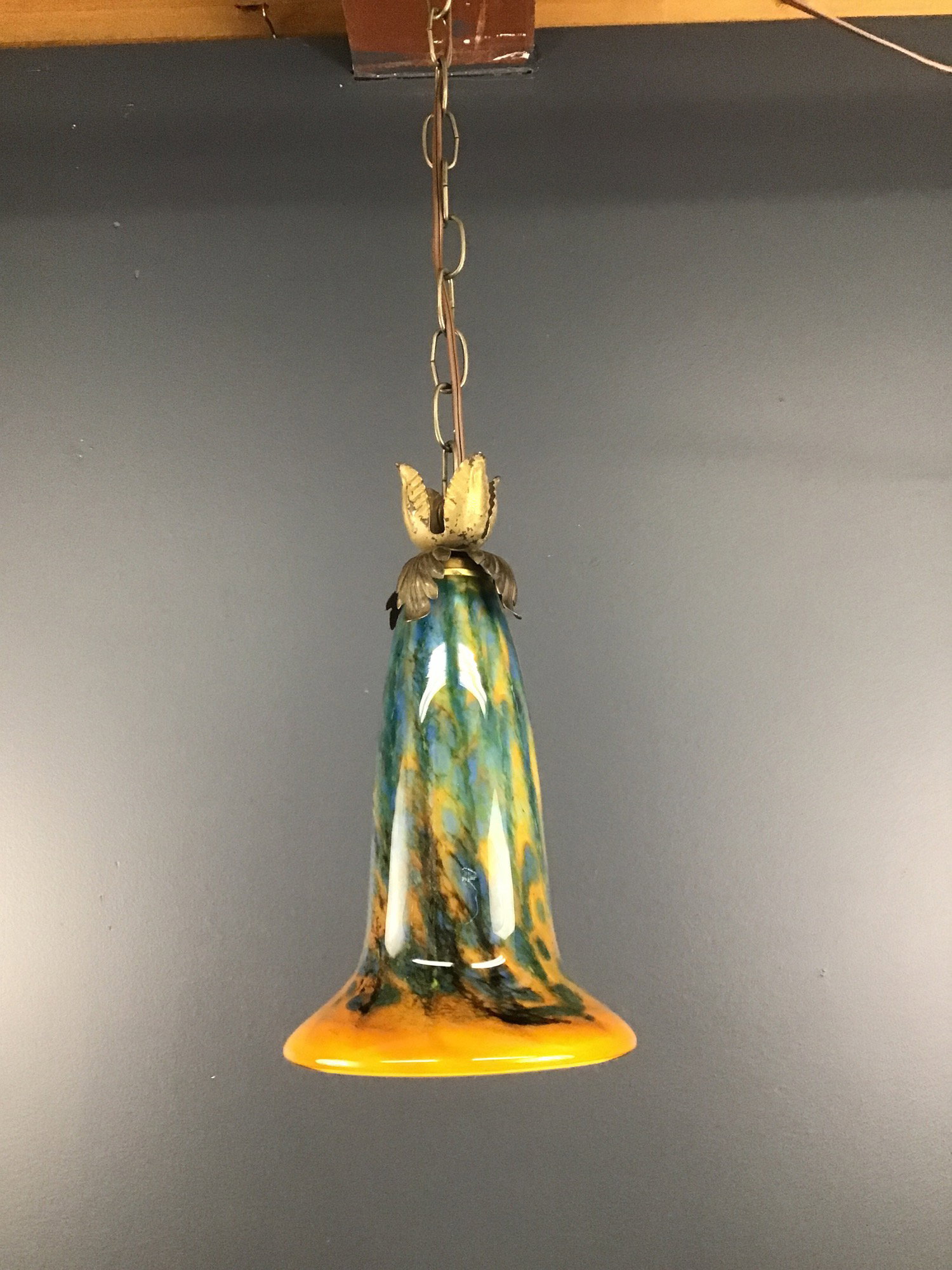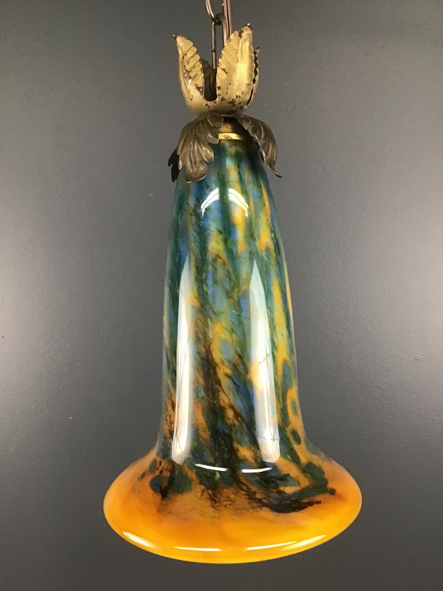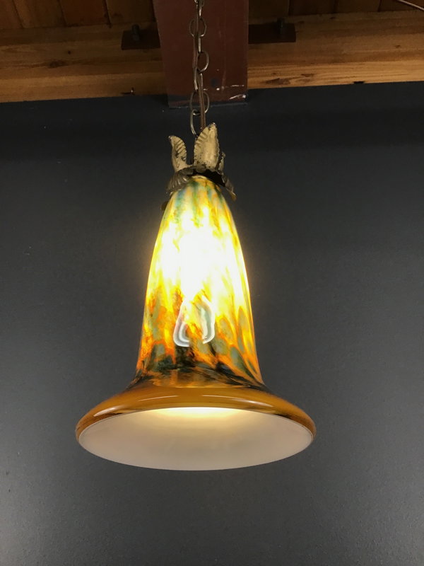 An Art Nouveau style pendant light that was made from an art glass shade from the 1990s, and decorated with antique brass acanthus leaves from the 1890s! Acanthus leaves symbolize endurance, rebirth, and long life. Hangs from a short length of chain and 12' of cord with a plug and inline switch. Built in our on site light repair workshop.