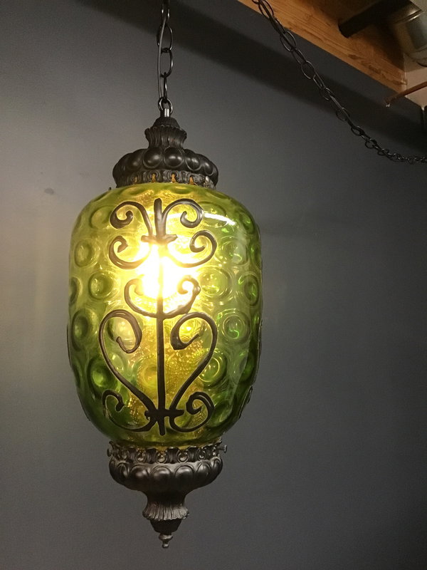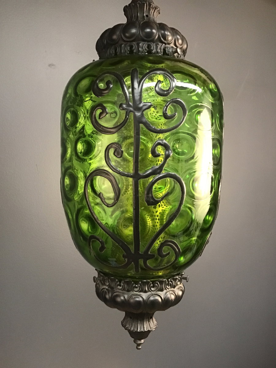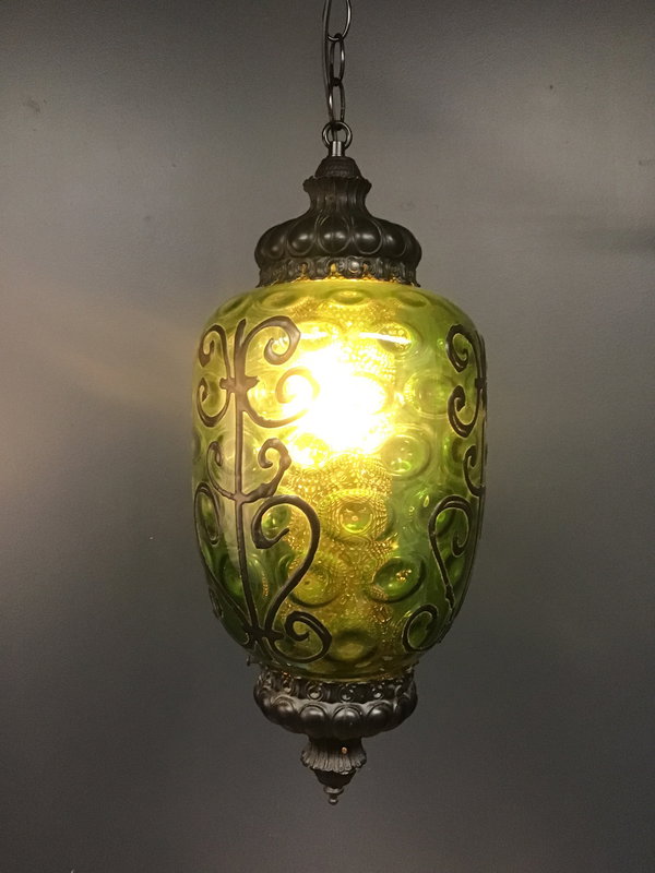 An amazing 1960s Hollywood Regency swag light with a green glass globe that has black accents, and hangs on a 14' long chain and cord with plug and inline switch. These are getting harder and harder to come by! So groovy! Restored in our on site light repair workshop