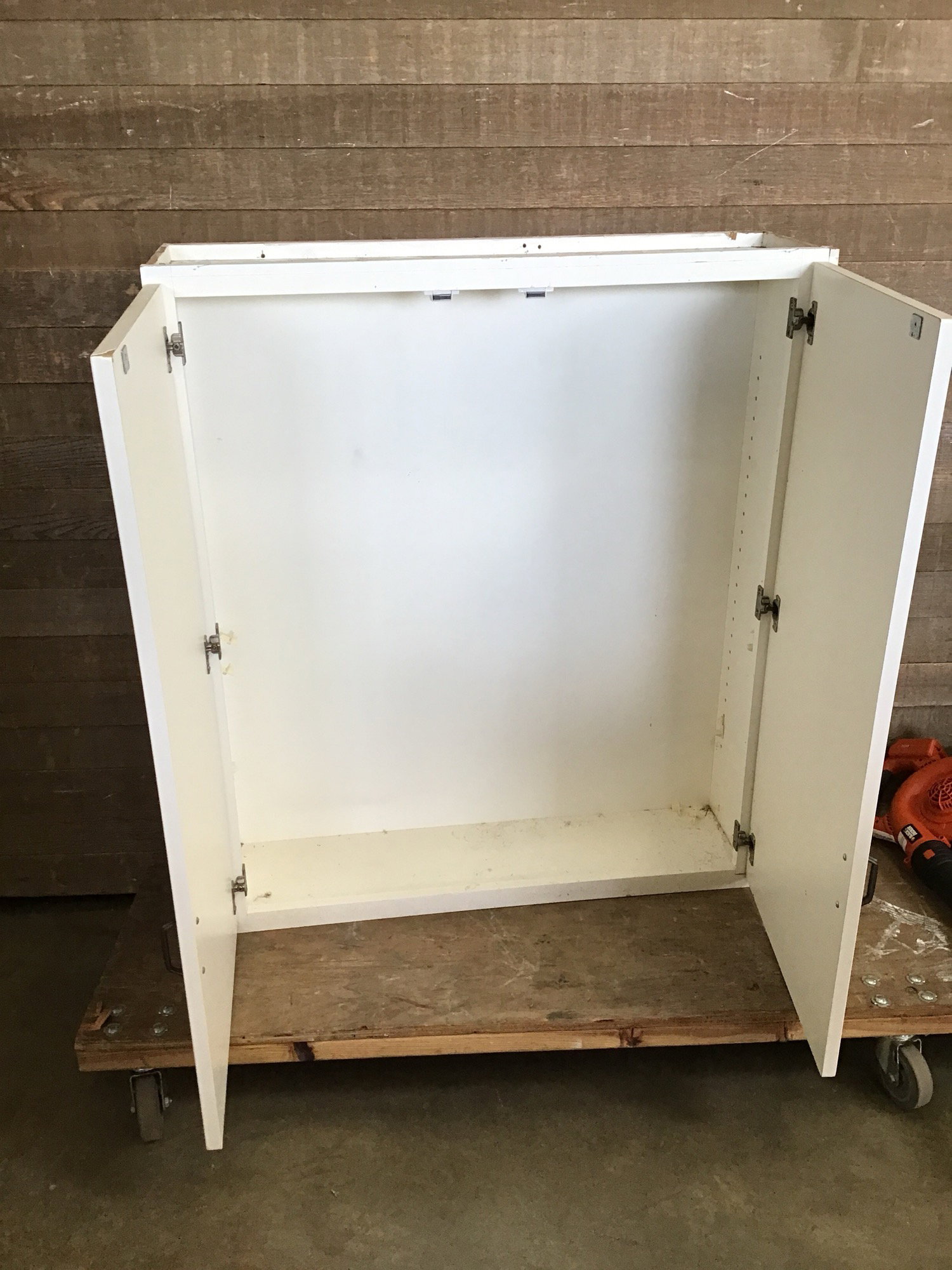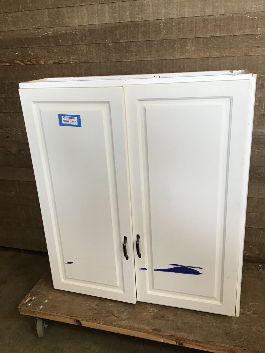 2 door upper cabinet with particle board box build. Doors appear to be made of MDF and are a little wonky. Cabinet still stands proud just needs a lil love.