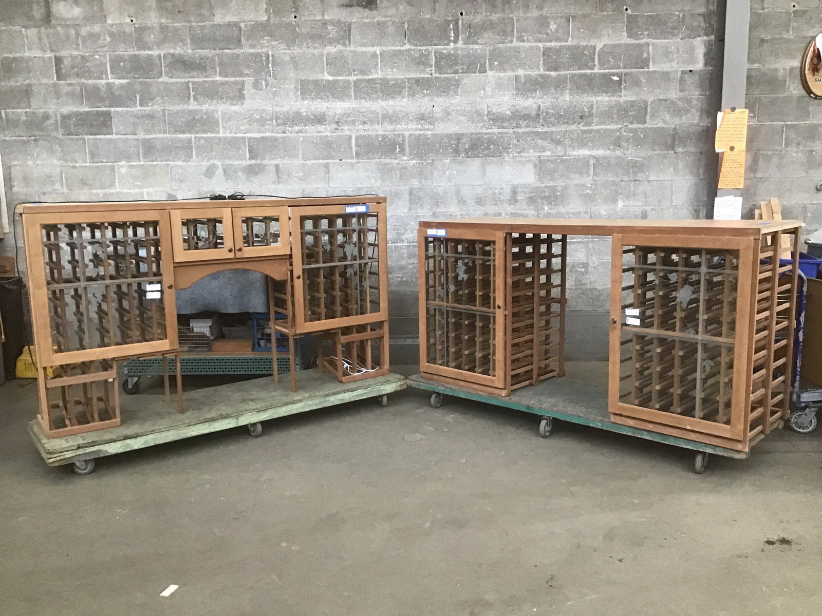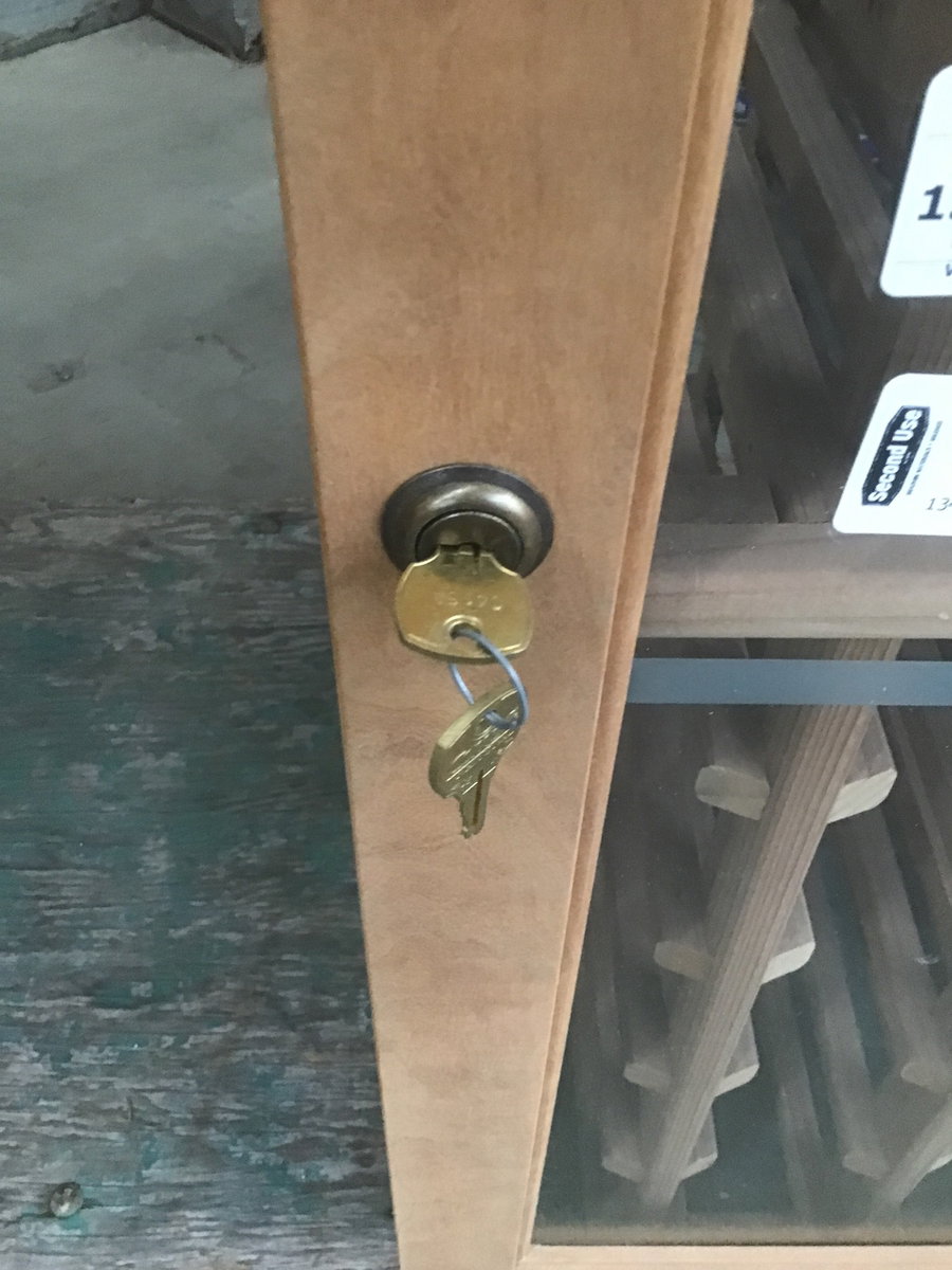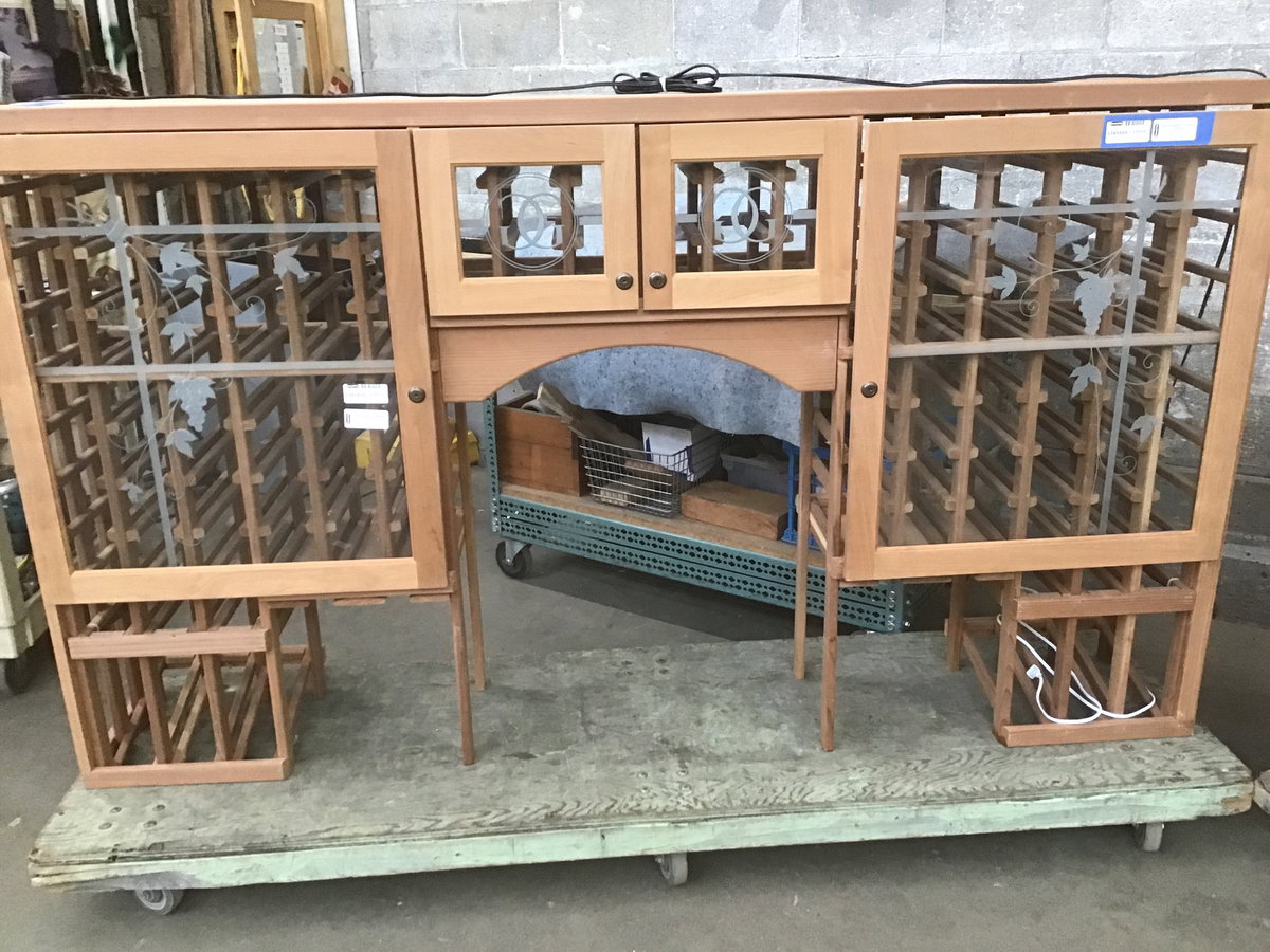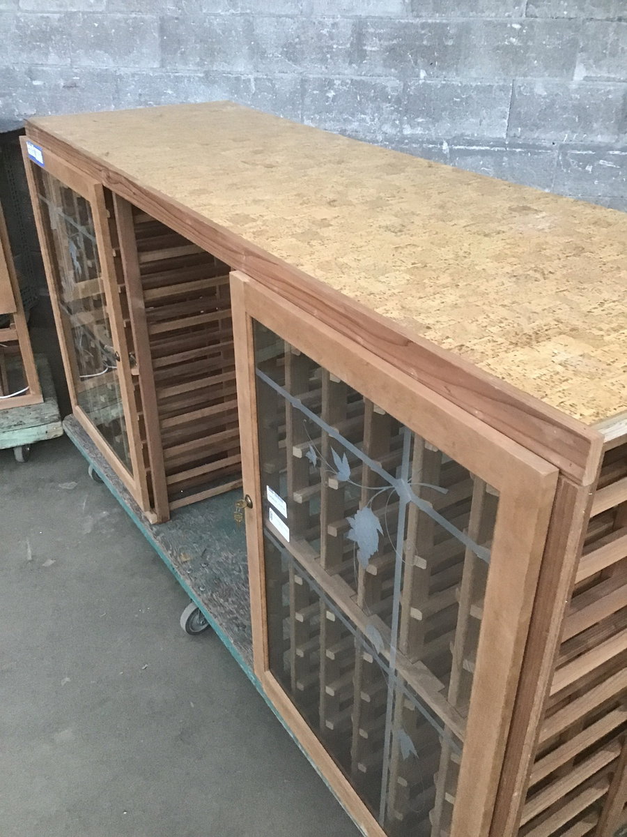 Well built, two piece wine rack with locking birch faced glass doors on all the wine storage compartments. The lower base (width & depth listed, height is 40 1/4") has a cork countertop and looks like you could store two bottles in each of the 120 compartments (enough space for 240 bottles). The upper unit has room for 118 bottles (13 1/2" deep x 46 1/2" tall). The top looks to have lights installed that plug into an outlet.