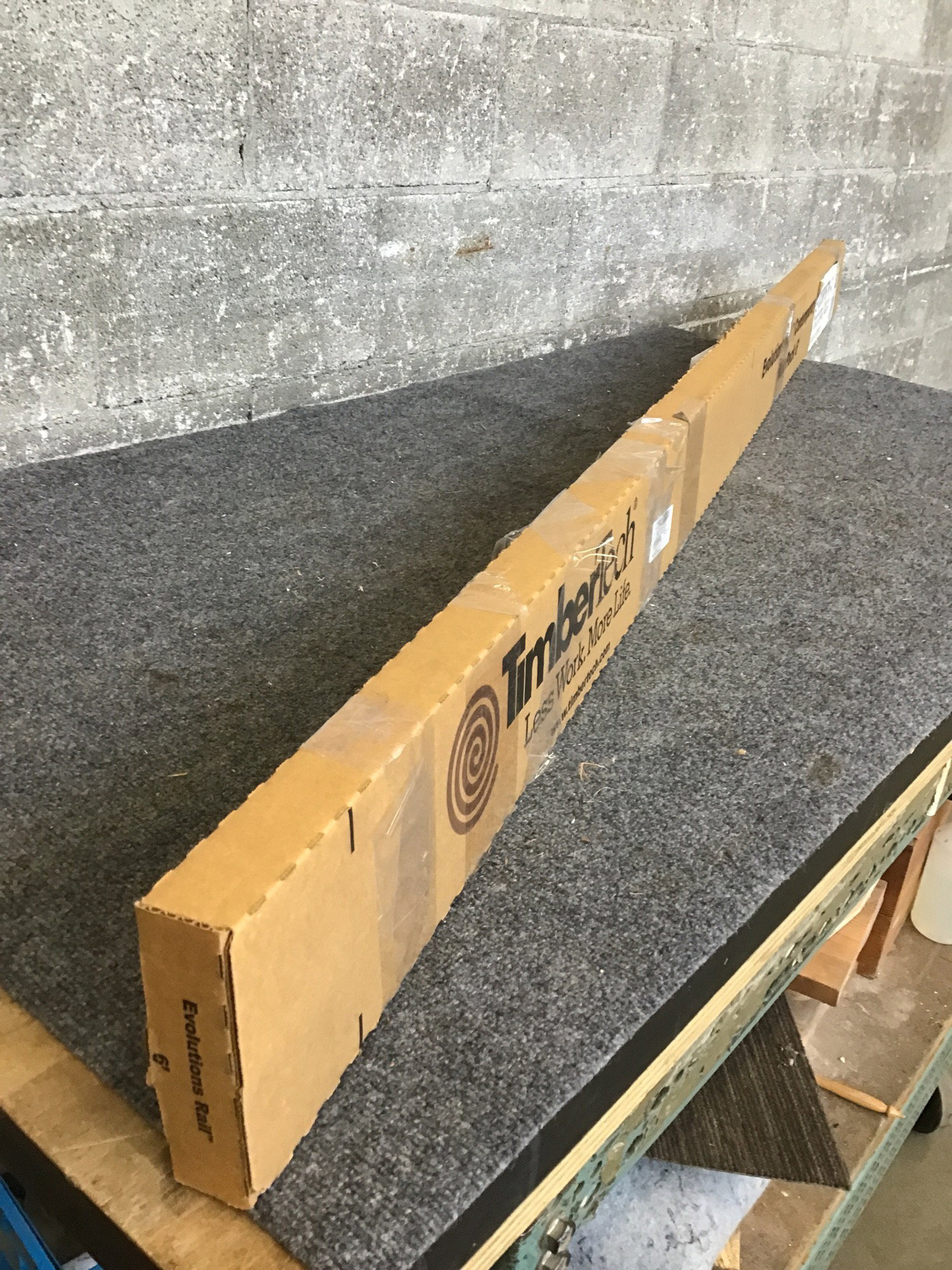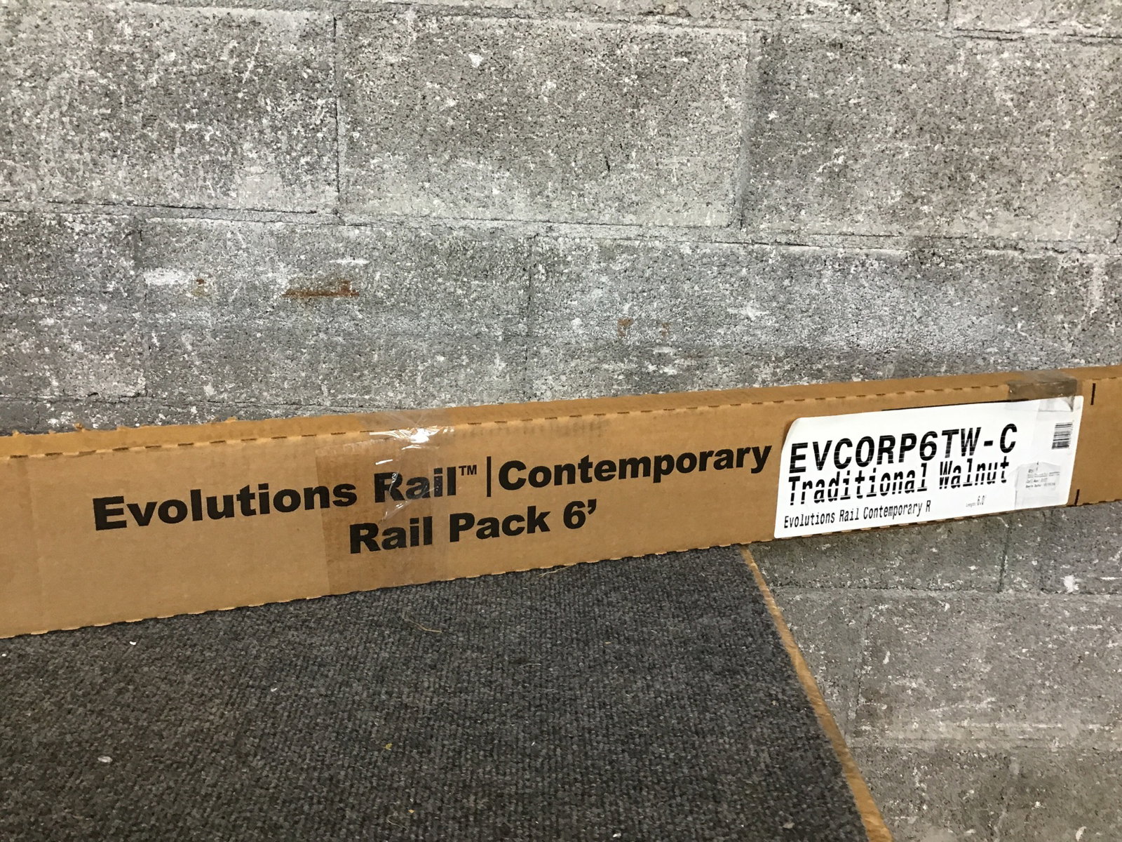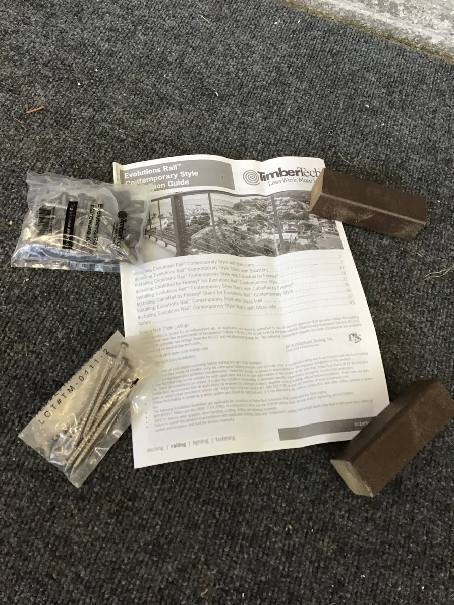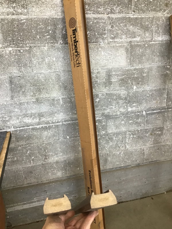 Two piece pack of TimberTech (composite) "Evolutions Rail, Contemporary Rail Pack 6'" in Traditional Walnut color. Pack comes with paperwork & fastener packs. These look to have a 1 1/4" wide "dado" groove for (not included) balusters.