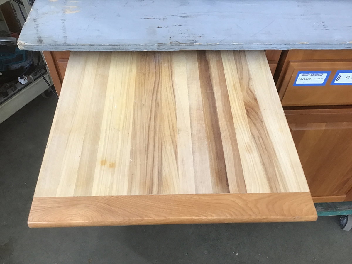 Cherry cabinet set ca. 2004 with raised panels and particle board boxes. This set includes dovetail drawers, a lazy susan and upper corner cabinet, one upper with fluted glass doors, wire pull-out shelves, and a butcherblock cutting board.