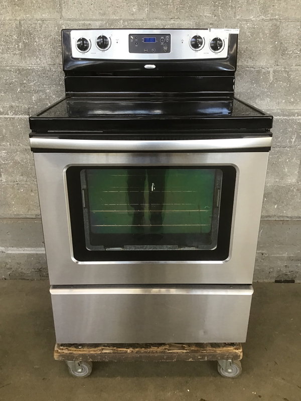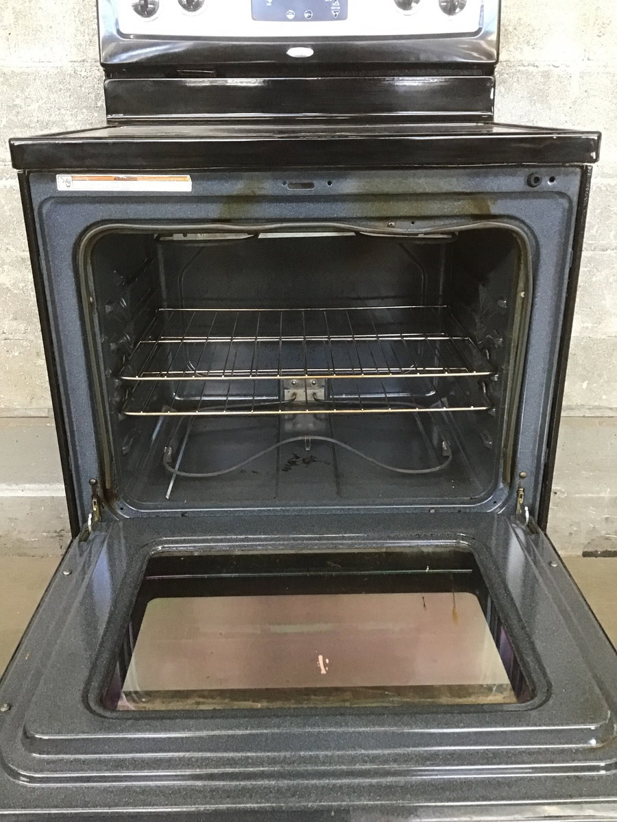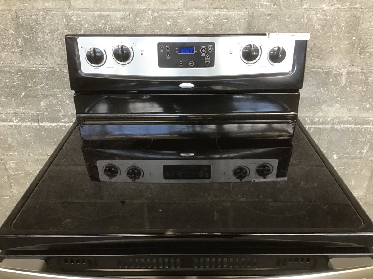 Functioning 2010 Whirlpool electric range with a big, but not super conspicuous chip on the front edge and the oven door gasket (the part on the range body) needs to be replaced. Price reflects. All this considered the Ceran top is actually in decent shape and the unit works fine.