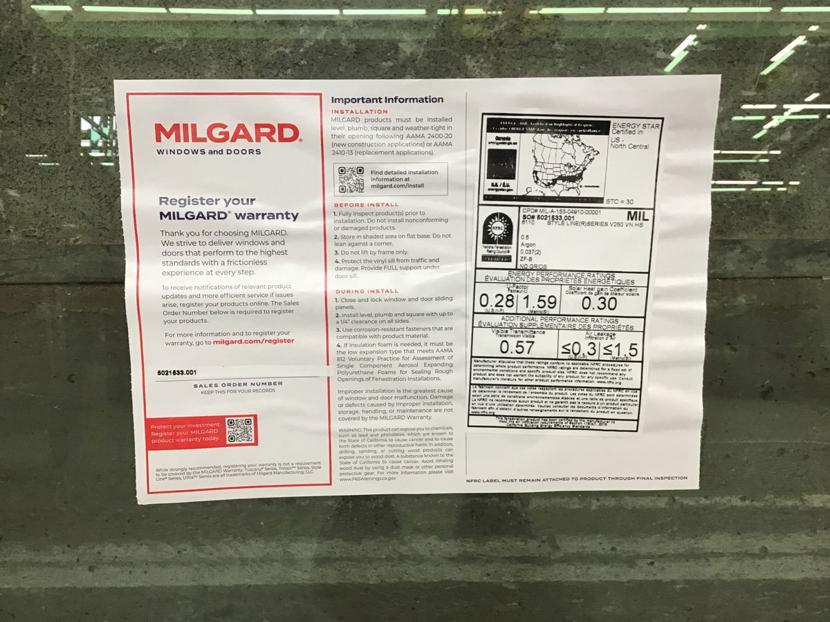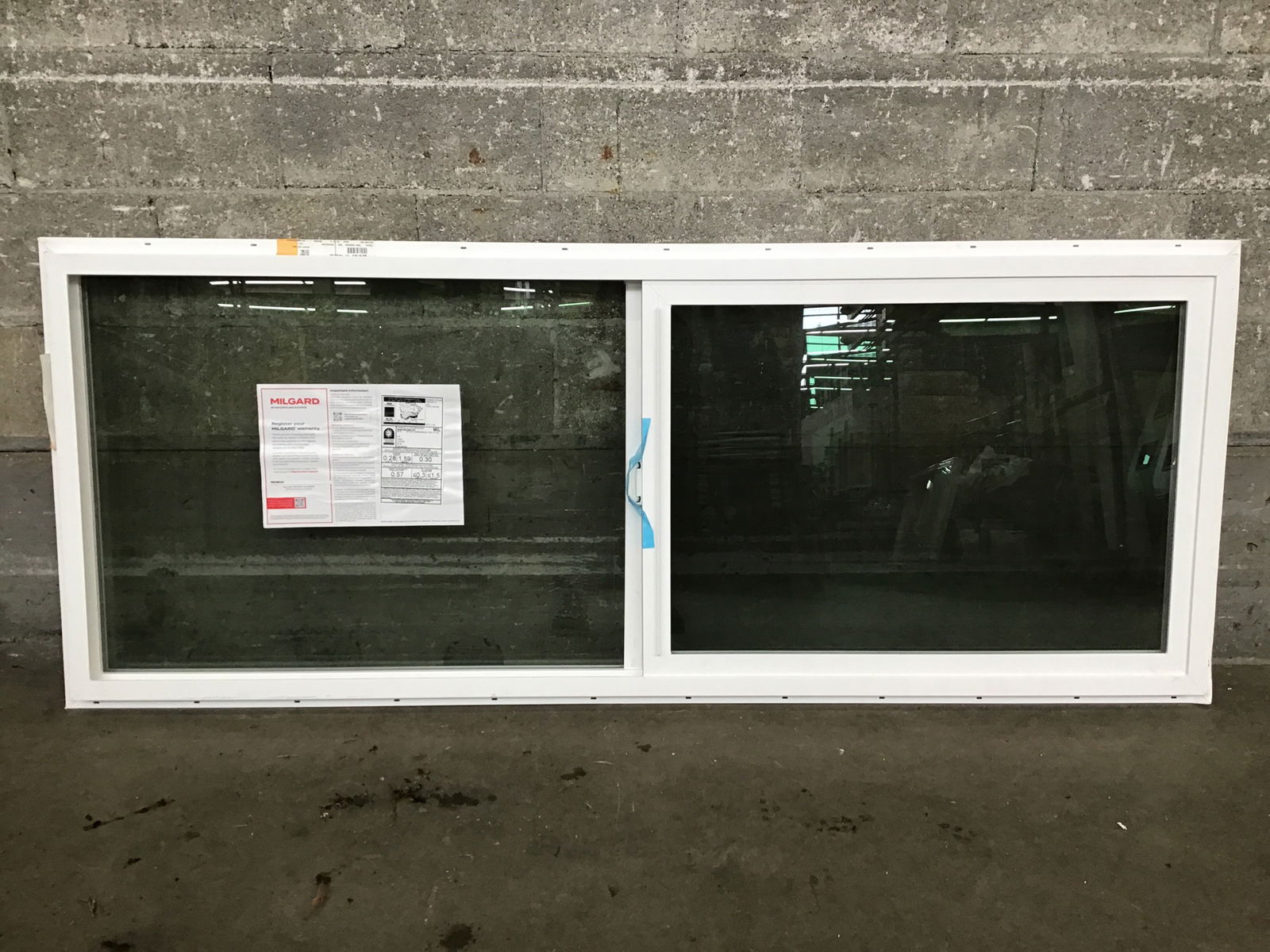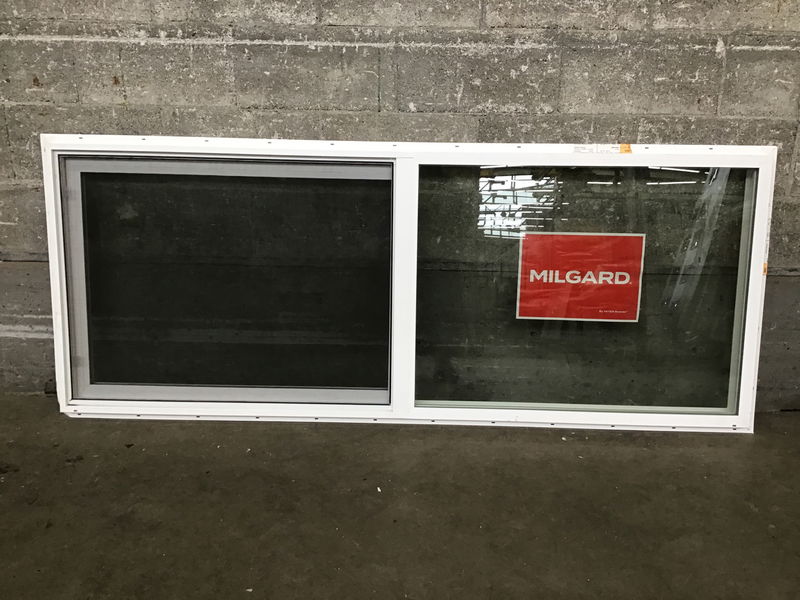 New, never installed Milgard XO vinyl slider with energy tags still attached.