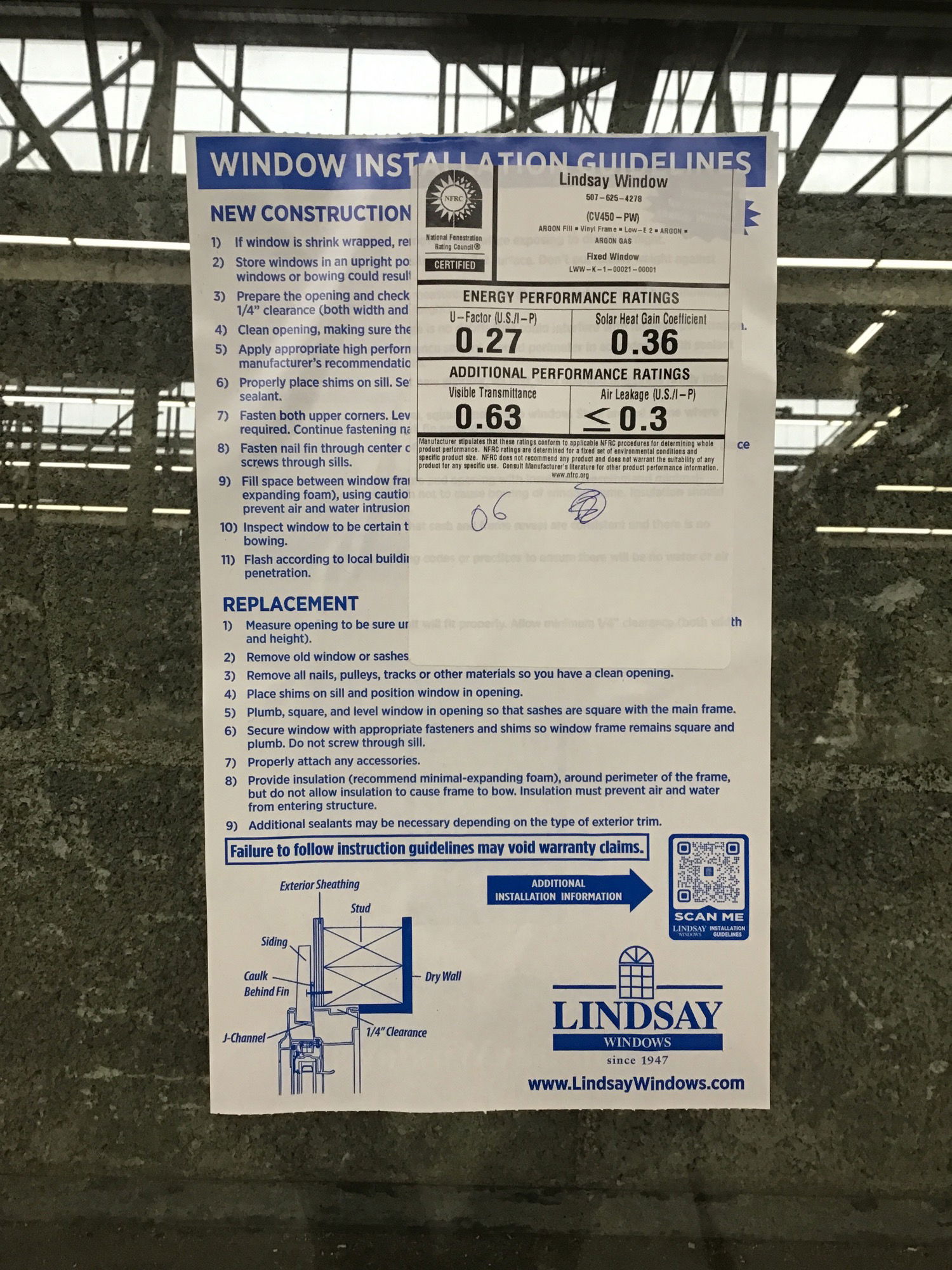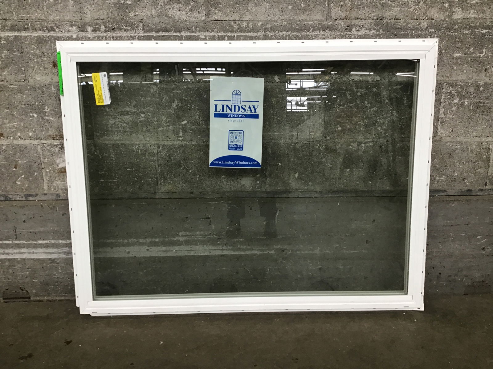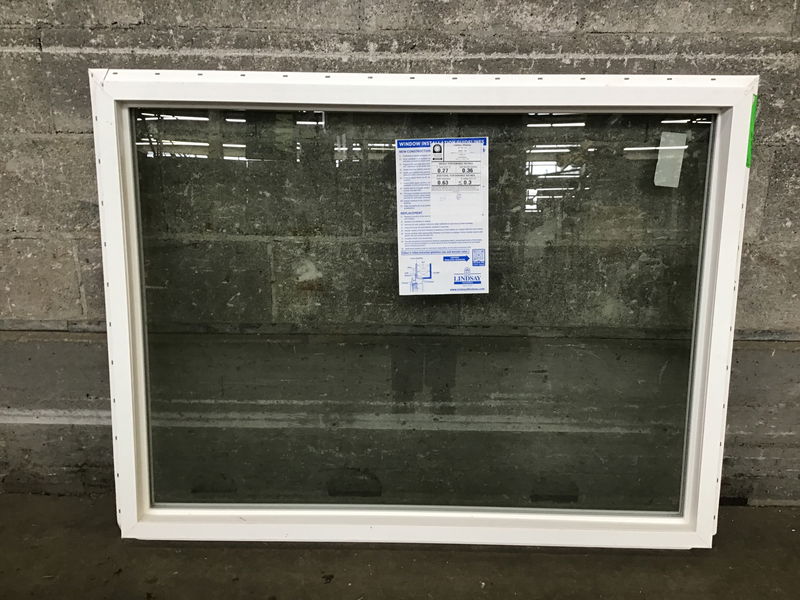 New, never installed Lindsay fixed vinyl window with energy tags still attached.