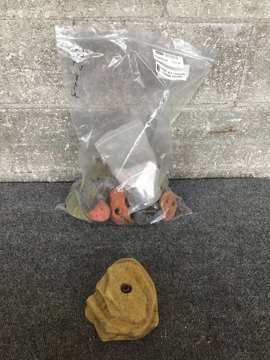 Bag that contains twenty-two rock climbing type grips for your back yard wall. Some are quite small. Some are bigger. USE AT YOUR OWN RISK!