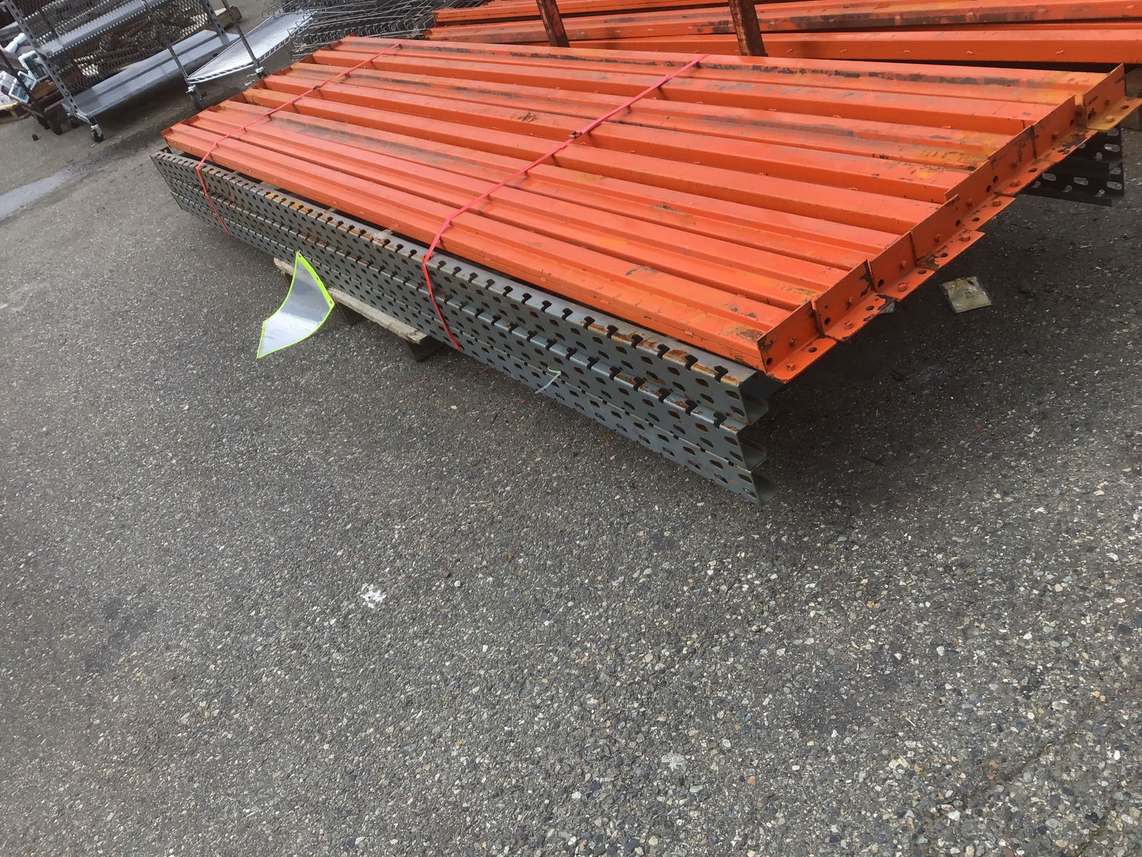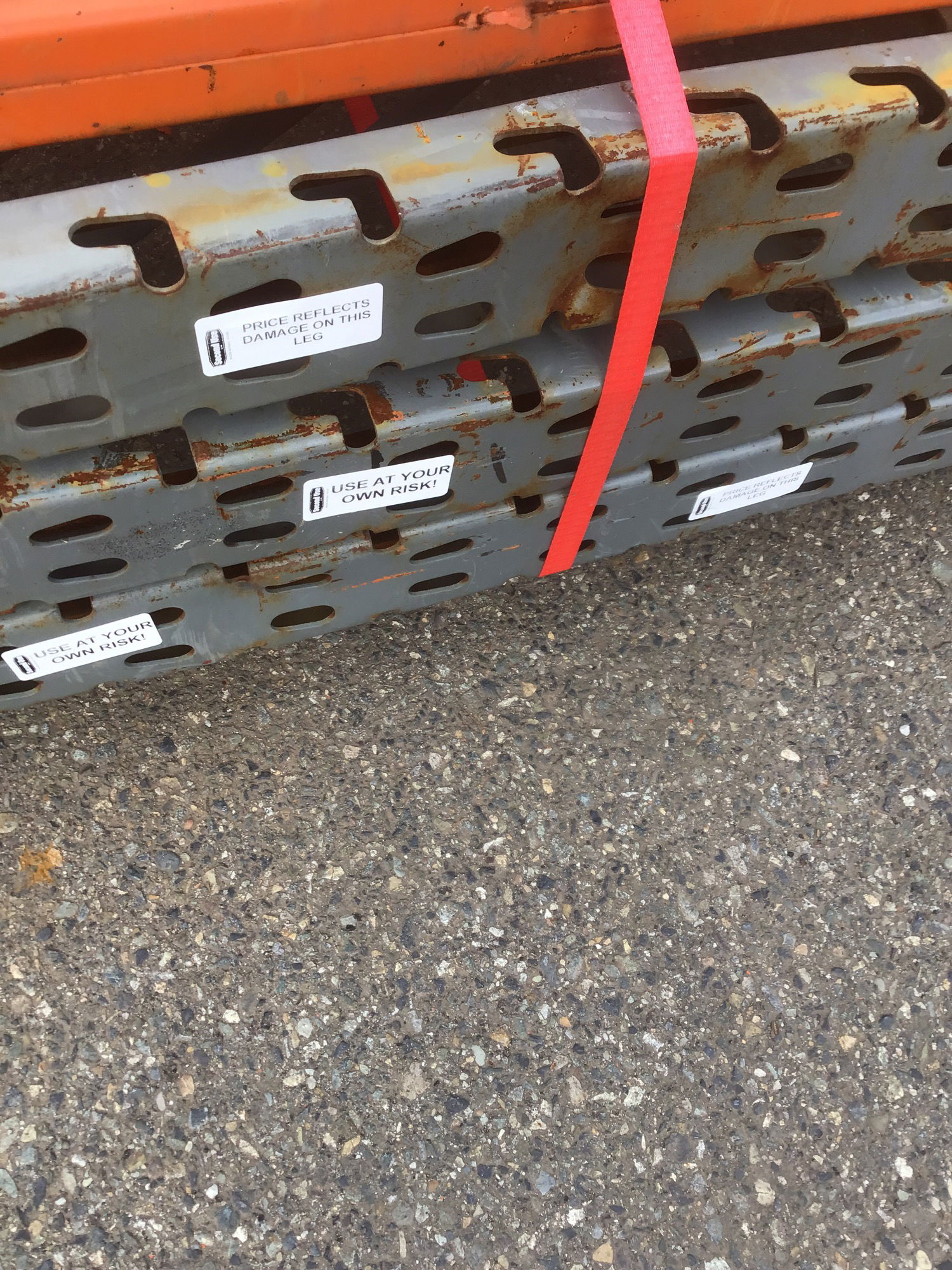 USE AT YOUR OWN RISK! This small lot of pallet racking includes three 12' tall uprights that all have a ding or bend near the bottom of one post (probably from being hit by a forklift). Probably best suited for light duty storage at this point. Comes with eight 12' long cross beams, which will give you two shelves in each section to run just over 24'. We do have more cross beams of same length that match (see item #1320541), so if you'd like more shelving that's an option. This is NOT the Interlake "Teardrop" style racking, but the style that uses two perpendicular pegs at each connection to push in and seat. Item may have cosmetic damage and a ding/dent here or there.