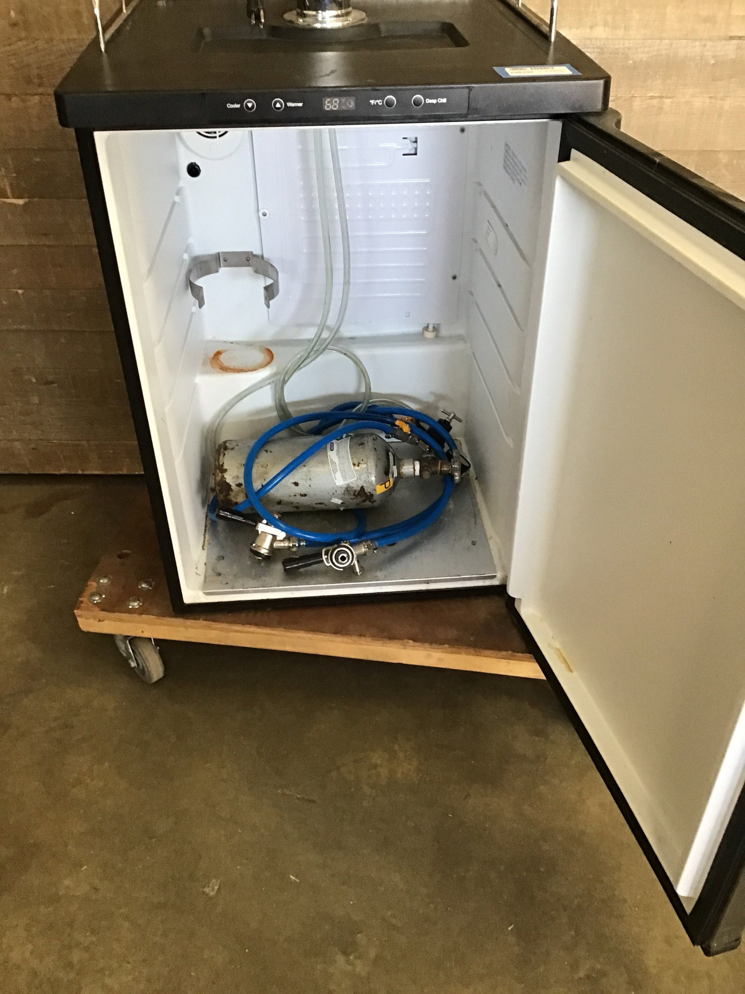 Well used but when tested chilled right down, getting the inside at the perfect chilly beer temperature. Comes with a CO2 bottle and regulators to set your keg up.