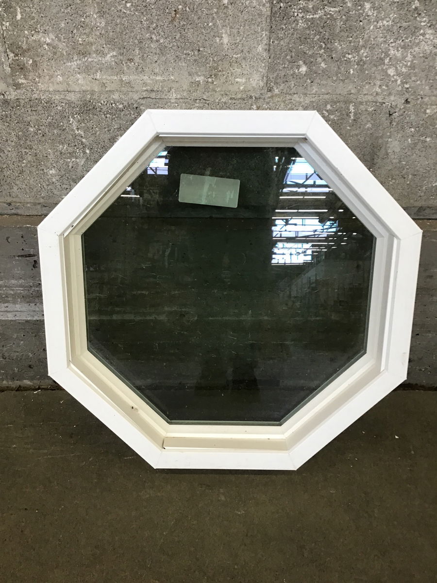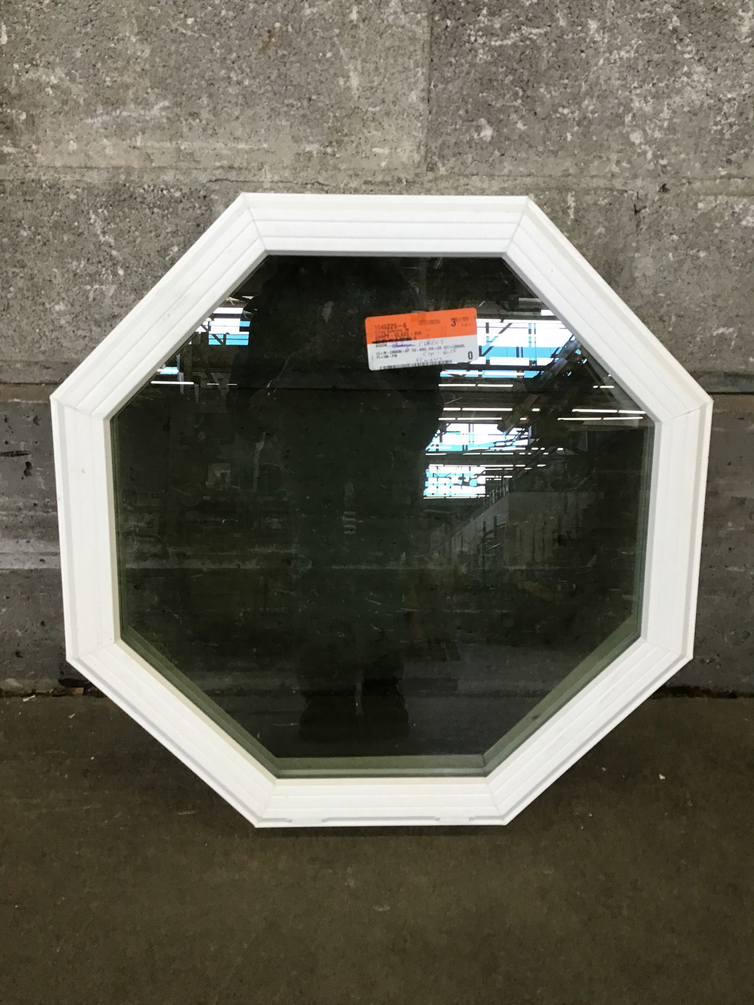 Ca. 2025 white vinyl fixed window in the shape of an octagon. Never installed and ready to shed some fun-shaped light on your home!