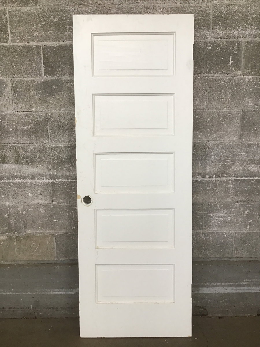 Heavily painted but fairly crisp and clean looking five-panel door. Has a standard/modern knob cutout vs. a vintage mortise.